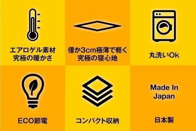 宇宙服素材の「エアロゲル」に加えて、熱を逃さない「アルミ蒸着シート」、さらに中綿には機能性中綿を採用。こだわり抜いた6層構造により、寒さをしっかり遮断しながら、快適な温もりをキープする掛け布団が誕生しました。