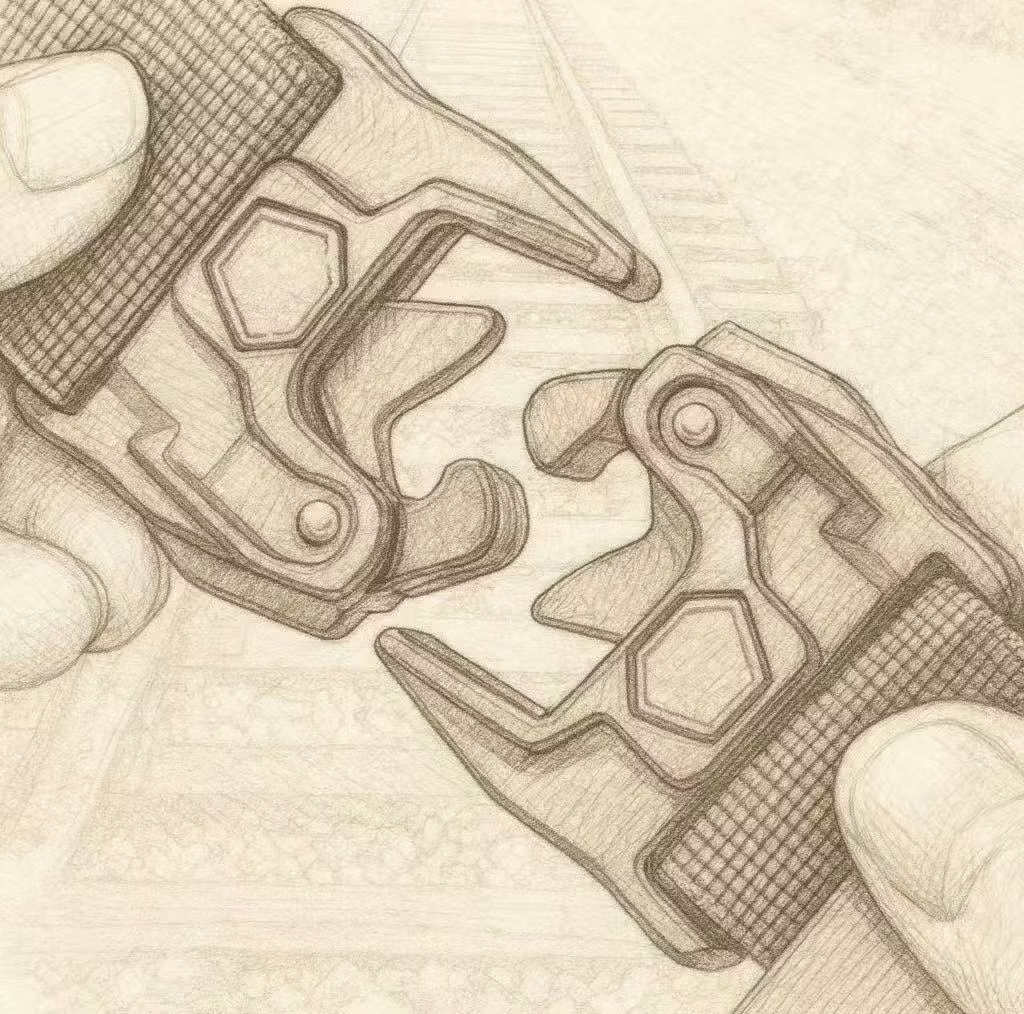 このバックル構造は、鉄道車両の連結機構をヒントに開発されました。スムーズで確実にロックされる“プロ仕様”の仕組みです。