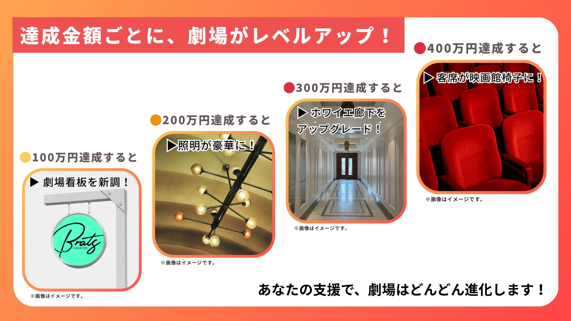 2026/04/08 11:553月31日にてクラウドファンディングが終了いたしました。みなさま、この度は当プロジェクトにご支援・応援をお寄せいただき、本当にありがとうございました!目標支援額達成とはなりませんでしたが、62%達成、110名の方にご支援いただきました...!本当に心から感謝の気持ちでいっぱいです。いよいよ4月より、劇場のリニューアル工事がスタートしました!スタッフ一同、どのような姿に生まれ変わるのかワクワクしております☆改めまして、この度のご支援に、重ねて深く御礼申し上げます。本当にありがとうございました。新しく生まれ変わった劇場で、皆さまとお会いできる日を心から楽しみにしております! もっと見る