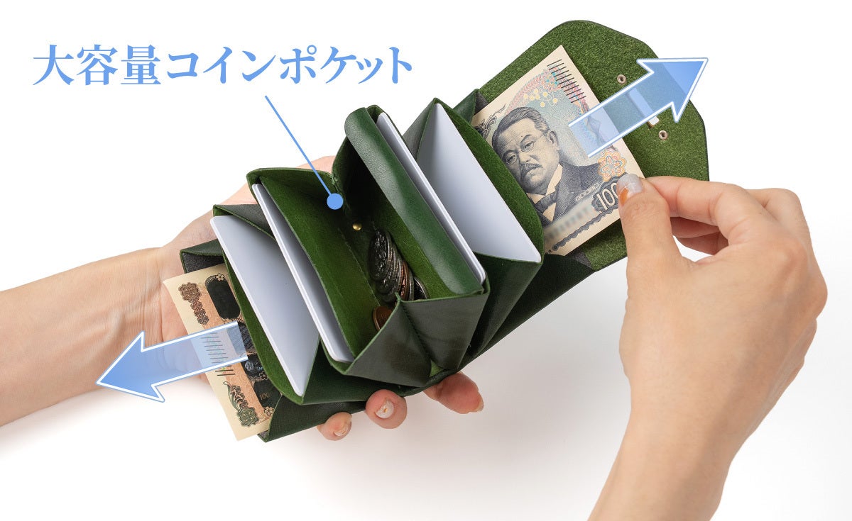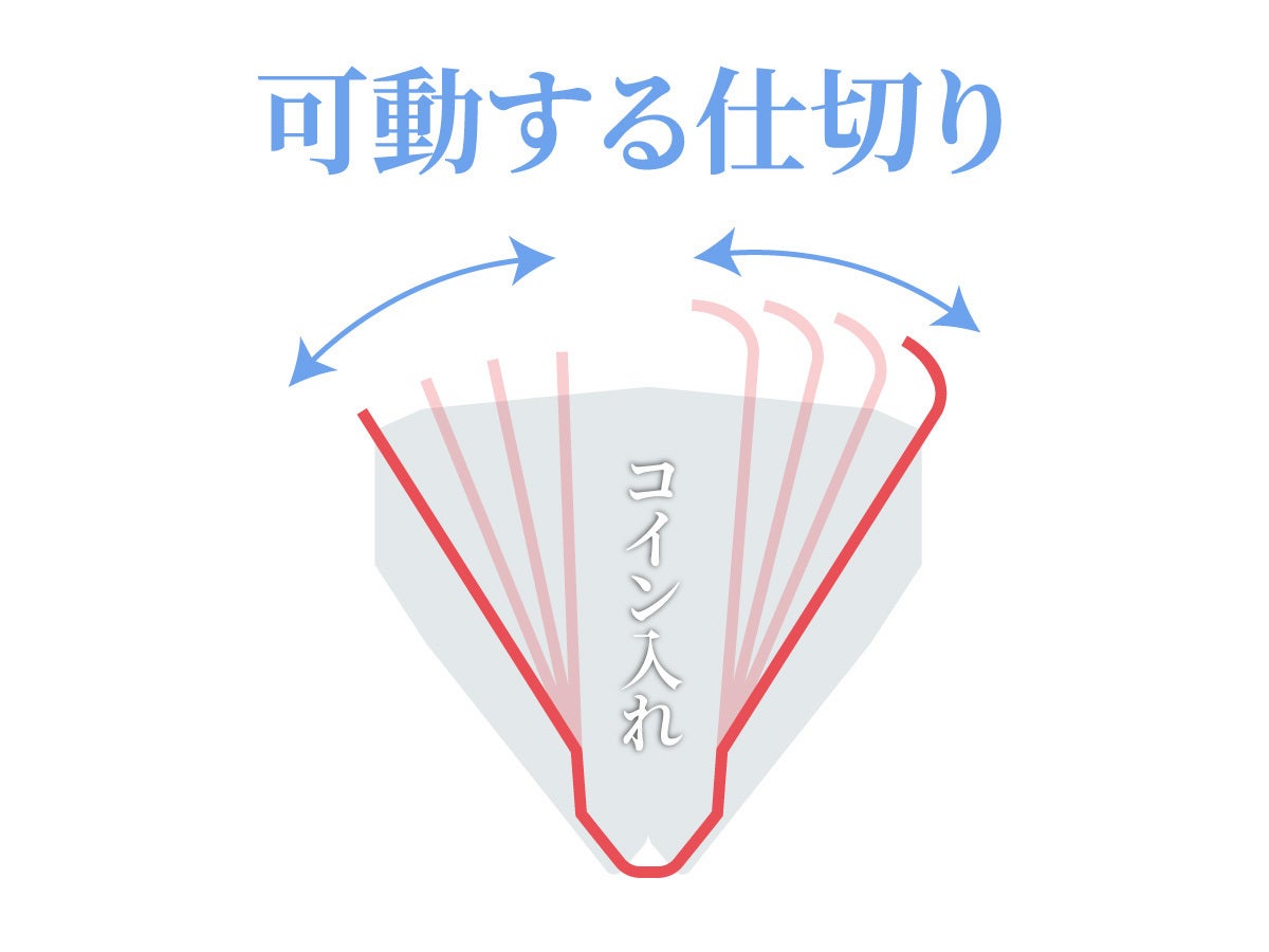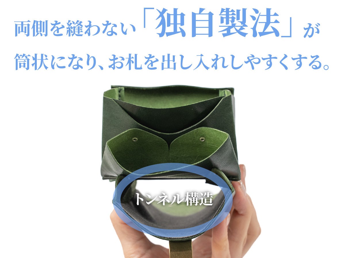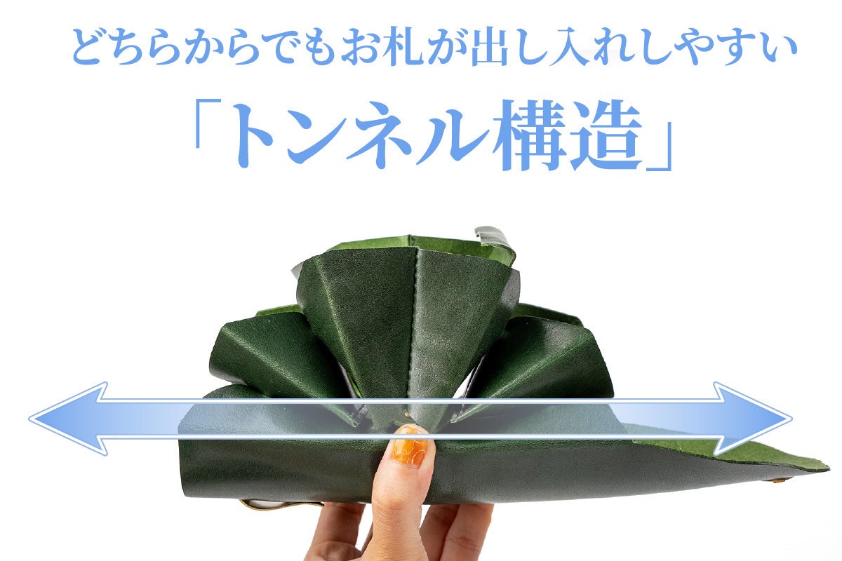お札を折らずに収納ができます。さらに独自のトンネル構造がお札を両側からの出し入れを可能にします。