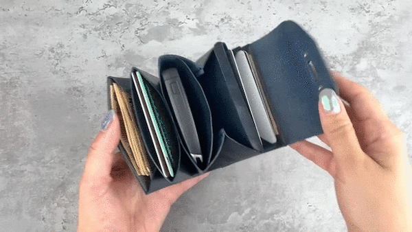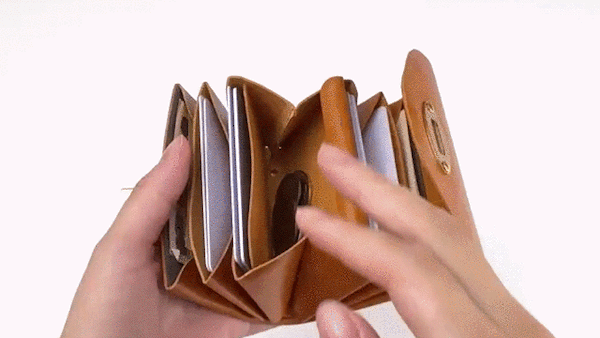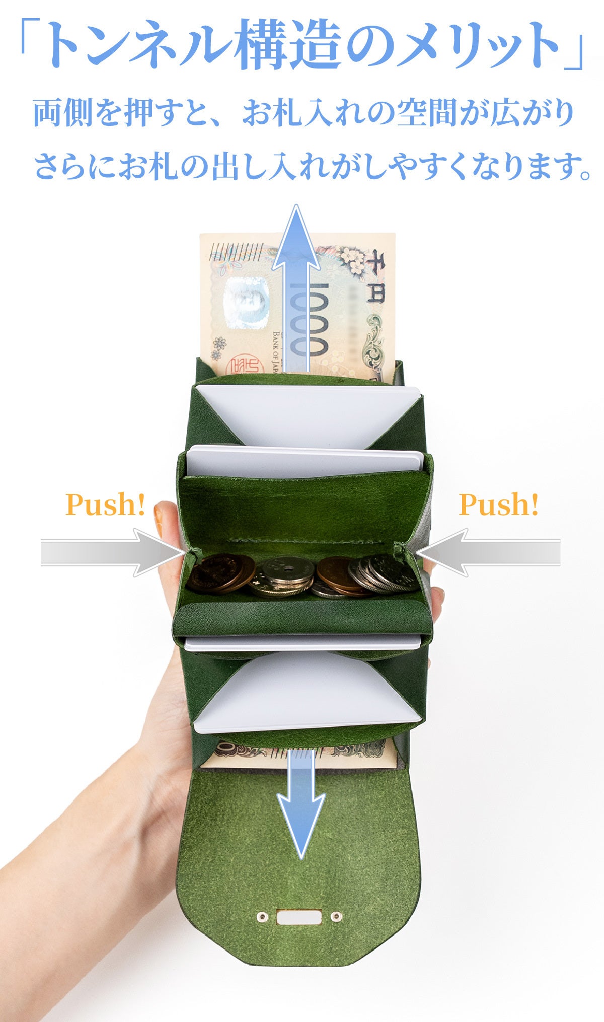 お札を折らずスライドさせるコンパクト財布は、お札の出し入れの際にひっかかりがち。そんな時は本体を軽く両側から押すと、トンネル構造で空間が真っ直ぐ広がるのでお札がスムーズに出し入れすることができます。