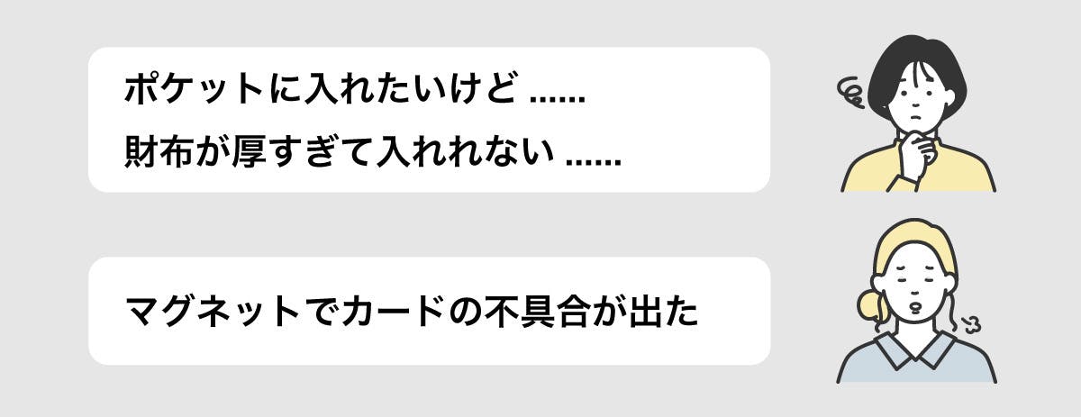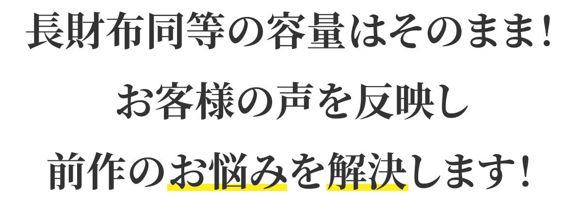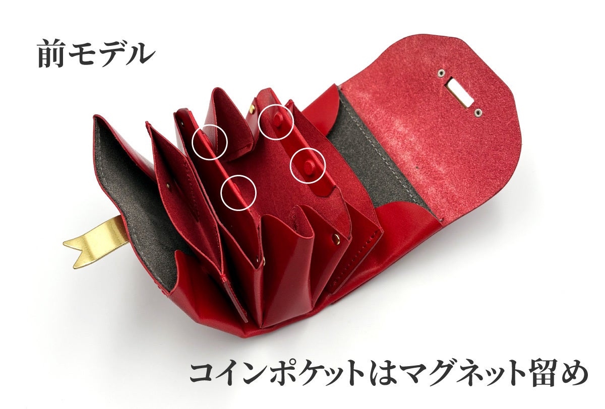 前モデルのコインポケットはマグネットで留めるタイプを採用。このマグネットが原因でサイドのカードケース内のカードに磁気不良を起こす事例があり、何よりも一番改善しないといけない箇所でした。