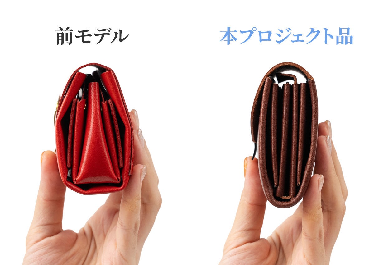 前モデルは一番厚みがある部分で約4.5cmの厚みがありました。財布が「厚すぎる」とご指摘があり、本プロジェクトでは約1cm厚みを減らすことに成功。また、前モデルでは底部分が厚く手で持ちづらい声もあり、手で持ちやすい形状に改善しました。