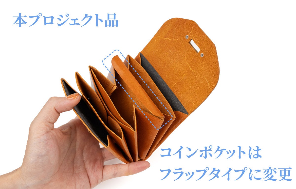 と修正版を作成する時に社内からも声があがりましたが、本体フラップとコインフラップの長さを何度も修正・試用を行いコインがこぼれない仕様ができあがりました。