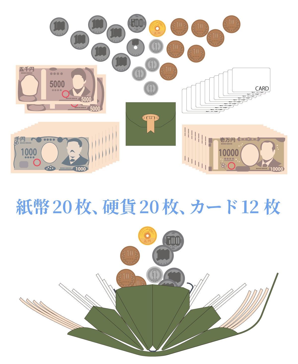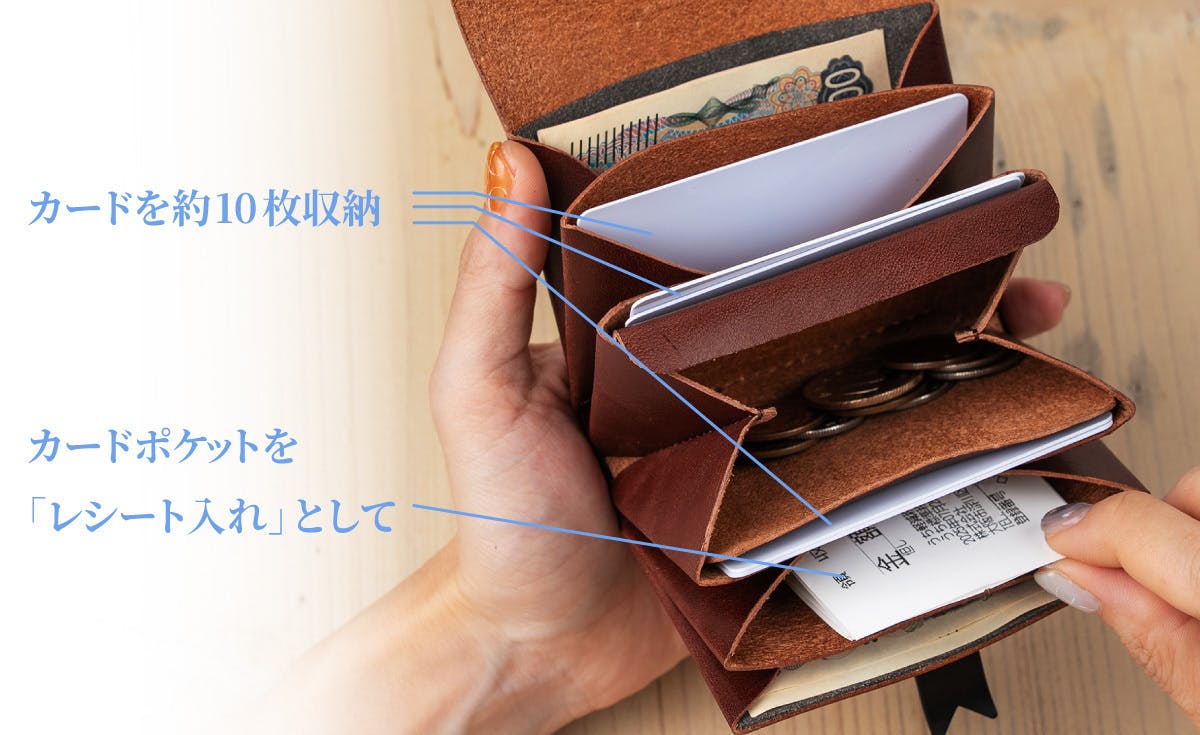 最大推奨容量は「紙幣20枚」「硬貨20枚」「カード12枚」です。推奨容量以上入れることは可能ですが、財布が変形する場合がございます。