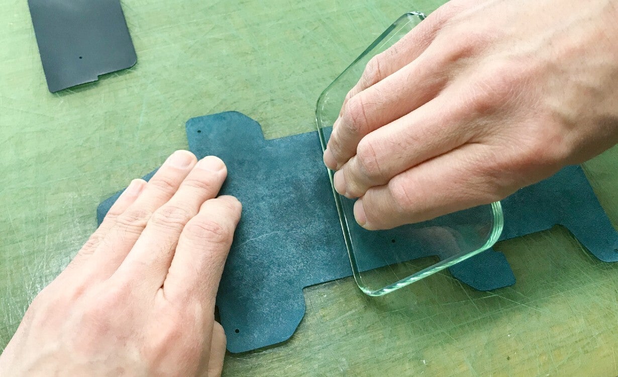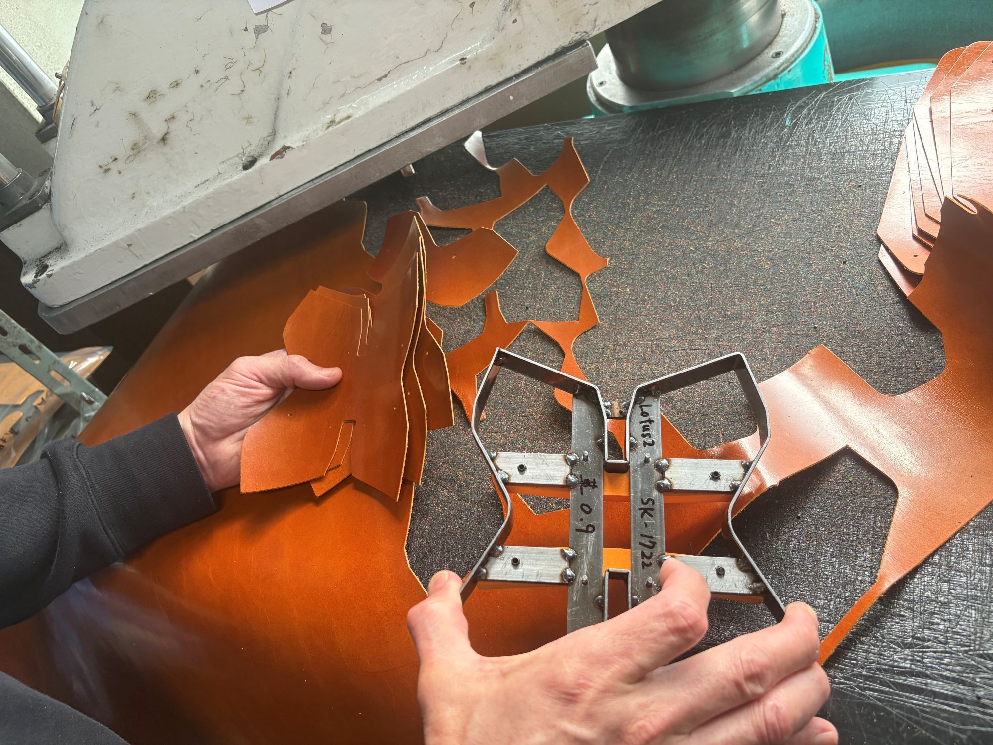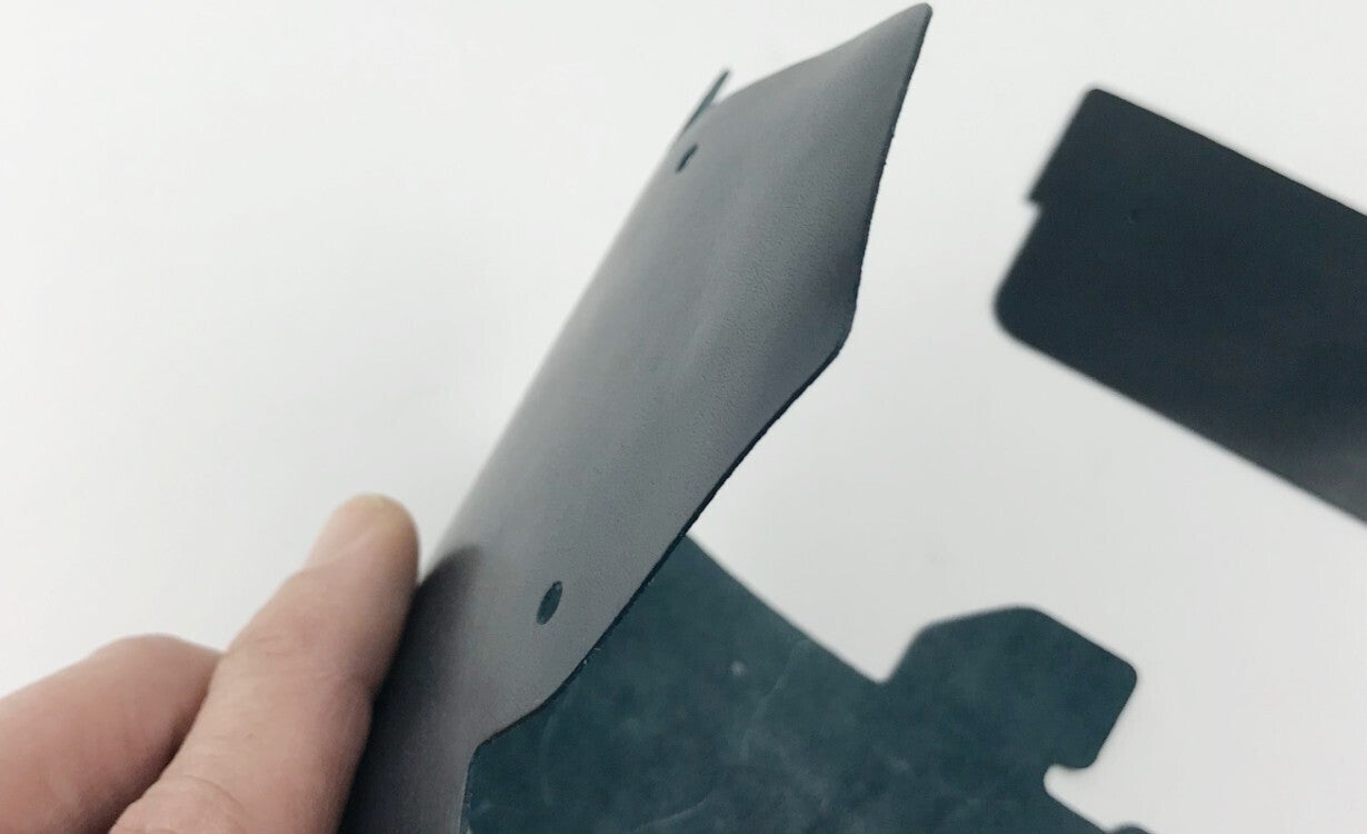 この製品の製作方法は先ず0.8mmと非常に薄く革を加工する事から始まります。