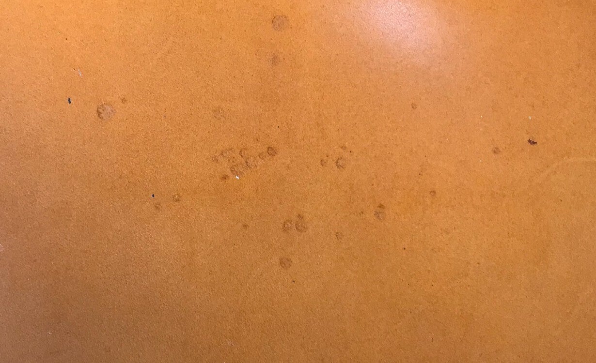 画像のような特徴を残す革です。大きく目立つ部分は避けながら製作しますが、この革の特徴としてどうかご理解のうえご使用ください。