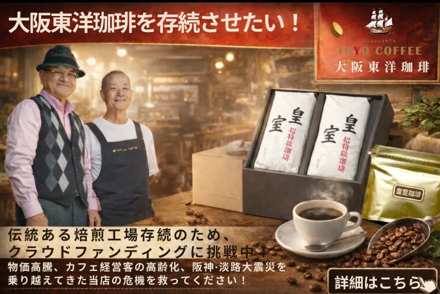 金額にかかわらず、今回のクラウドファンディングにて、少しでも一人でも多く、私たちがお作りしている「皇室珈琲」や「大阪東洋珈琲」について知って頂き、またご応援頂いたお客様様には、大変感謝しております。数多ある珈琲店の中で、私たちがお届けさせて頂くのは、ただの商品だけではなく、お客様との絆だと感じております。