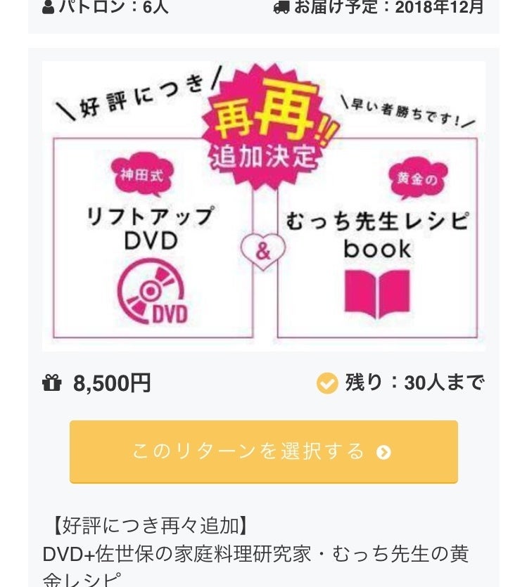 皆様のおかげさまで200%を達成いたしました。 会う人会う人に「やったね!」「おめでとう」と言っていただいています。 本当にありがとうございます。 ところが、人によっては 「私DVD5,000の支援しかできなかった。ごめんね」 なんて言う人までいるんです! いやいやいや! ごめんね?どゆこと? んなわけあるかーい!! たしかに私のリターンは高額のものも出しているけれど、統計を見ても女性の割合が85%だし、私は佐世保と言う地方の人間。 佐世保の女性が(特に主婦の方など)自由になるお金が多くないことは私もよーっく知っています。 中には自分のその月のお小遣いすべてを私の支援に費やした方もいるでしょう。 そんな一人一人の思いやご支援の人数やその中の女性の割合を考えると涙が出てきました。 皆様のお気持ち、ありがたく頂戴いたします。 そして他にもこんなご意見が。 「支援したいのだけど、どうしても登録から支援までのやり方がわからない。代わりにやってもらえないですか?」と。 最初は「いやいや、ご自身でやってみてください」と言ってたのですが、やはり難しい、という方も多いようです。 なので、今後は代理の対応もやりますから、私の方に直接ご連絡くださいませ。 本当にありがとうございます。 神田さゆり3分でほうれい線を飛ばすリフトアップDVD&佐世保活性化プロジェクト