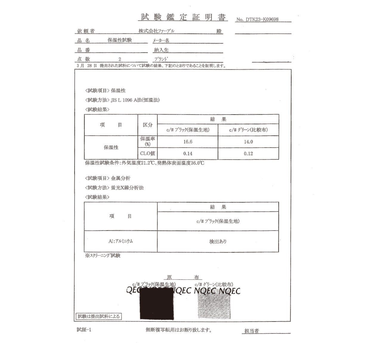 JIS L 1096 A法(恒温法)の保温性検査で弊社比較品より保温性の向上が確認されました。