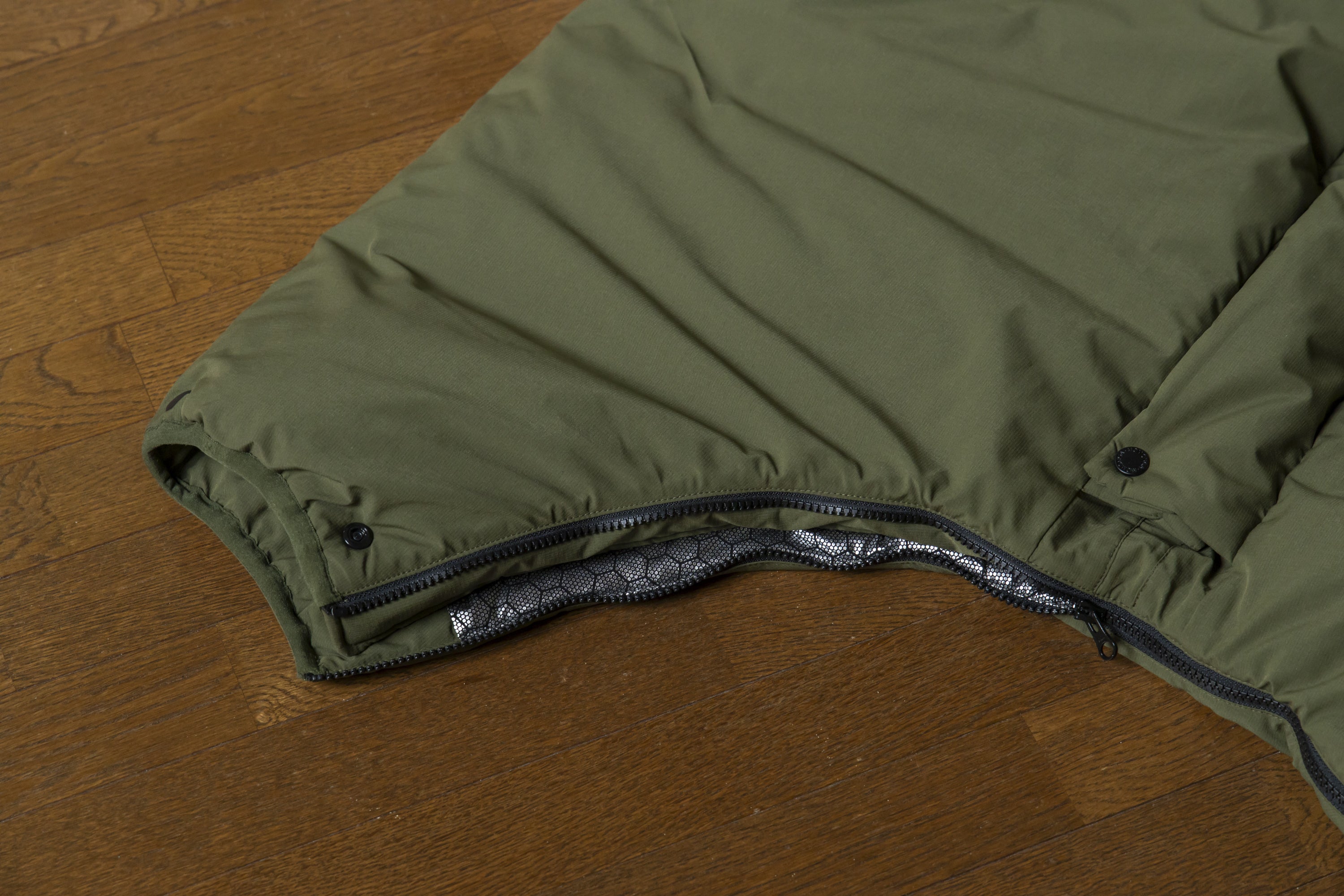 表地には引き裂け強度のあるポリエステルリップストップを使用しています。撥水加工を施しているので、水をはじき汚れにくくなっています。肌触りはマットでサラリとしています。