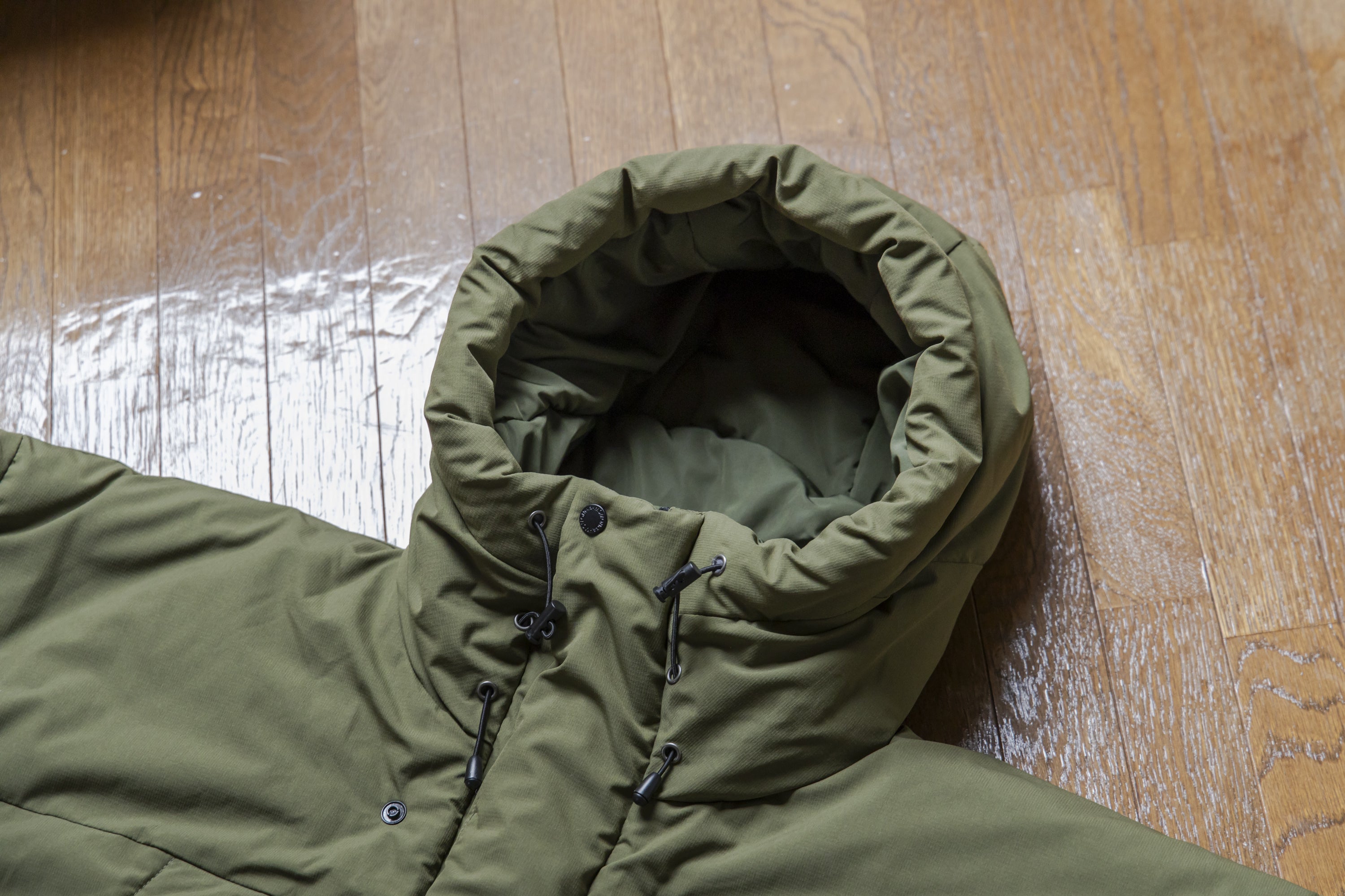 内側に中綿入りスタンドカラーの二重襟で保温性を高めています。