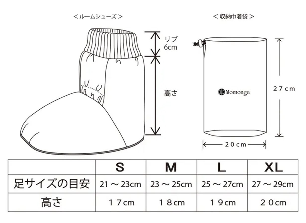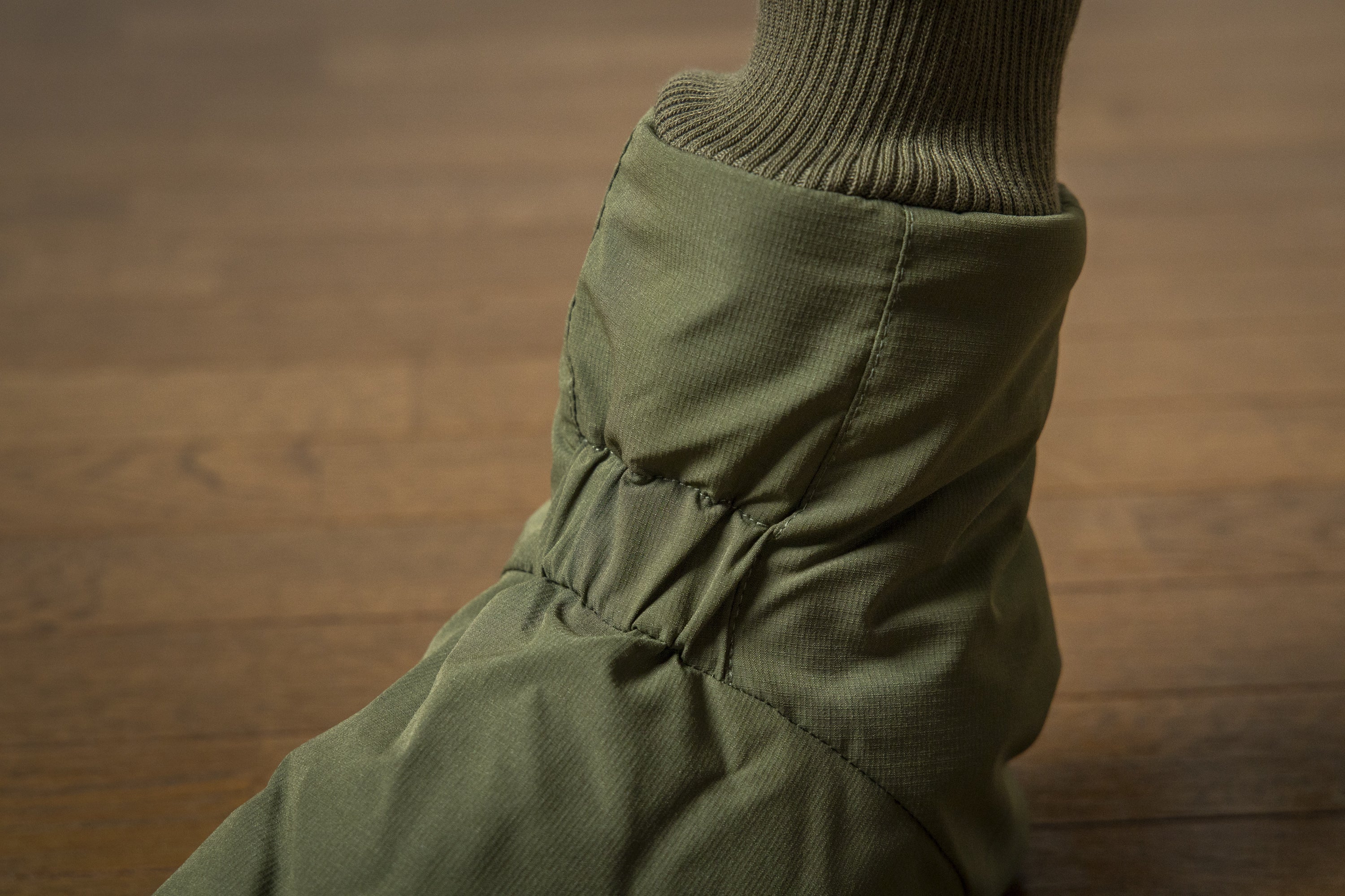 アウトドアではテントの中で足先を暖めるテントシューズが一般的ですが、もっと楽に履けるよう靴下風のデザインになっています。モモンガと同じ5層構造で、中綿はサーモライト中綿、裏地は保温裏地を使っています。内底はボアで暖かく、外底はフェイクレザーで滑りにくくなっています。(外履き用ではありません。テント内や室内でご使用ください。)