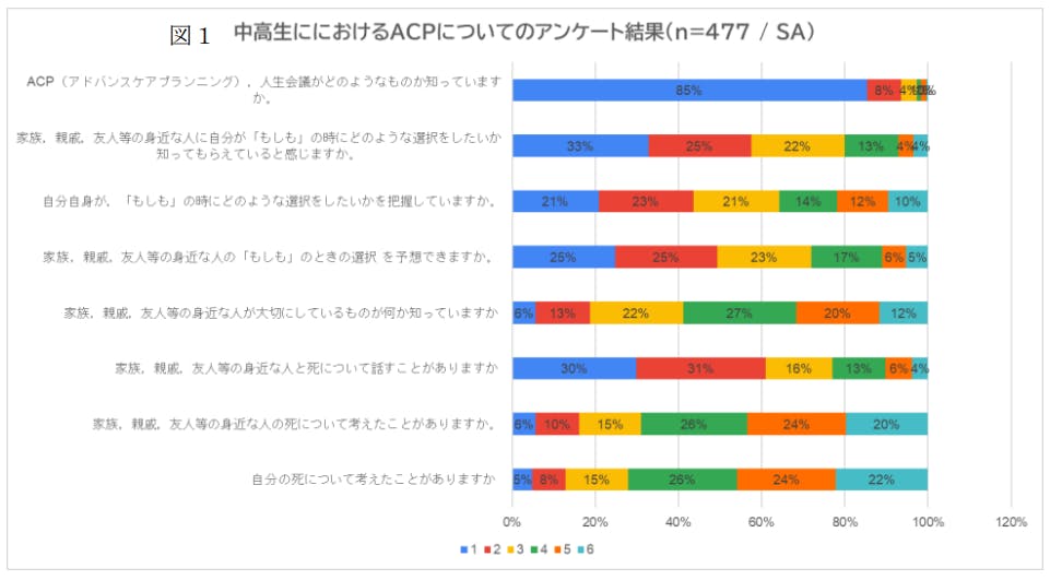 2026/03/11 11:194. 研究結果・考察 ①インタビュー調査の結果 医療現場では ACP をがん治療の後期など人生の最終段階で導入されることが多く、その内容は「本人 が何を大切にしたいか」をもとに治療方針を決める重要なプロセスであることが分かった。また、「死 について話すことがタブー視される日本社会の傾向」や、「若い世代が ACP を知る機会の不足」も指摘 された。また、若年層が早い段階で“自分らしさ”や“人生観”を言葉にしておくことの意義につい て共通して語られており、高校生において ACP を実施することの必要性を感じた。 ②質問紙調査の結果 全体の約 7 割が身近な人の死について考えたことがあると回答した一方で、身近な人と死について話 す機会はないと回答した人も約 7 割であった。しかし、身近な人と価値観は共有できていると感じて いる人はおよそ 6 割と半数を超えた。また、自分自身の死生観を「よくわからない」と感じている生 徒も約 6 割であり、多くの高校生が自分の価値観や死に対する考えを深く意識する機会が少ないこと が明らかとなった。(図 1 参照)③「もしばなゲーム」実践の結果 「もしバナゲーム」のようなカードゲームにより ACP のハードルが下がること、また生き方を考える 哲学的対話ができることを実感した。このことから、ACP は自分の価値観を見つめ、今後の「生き方」 を考える契機となりうるという示唆を得た。 ④高校生版「わたしの想いノート」の作成と活用 高校生向けに作成したこのノートは自分の価値観が可視化できるもの、かつ高校生が自分の想いを言 語化しやすい仕様にした。ノート記入者からは、「自分の死について考えたことがなかったが、死につ いて考えることにより、何を大切にして生活したいか、自分についてじっくり考えるきっかけになっ た」「迷ったときにこのノートを見返すことで、決意を新たにすることができると思った」という声が 聞かれ、若年期における ACP の有用性とノートが ACP の入り口として活用できることが推察された。 5. 結論・今後の展望 本研究では、高齢者や重篤患者に利用されてきた ACP が、アイデンティティの確立過程にある高校生 にとって、「生き方」を考える上で有用であることが分かった。また、作成したノートが ACP の入り口 となりえることが示唆された。今後は ACP が、十代の自殺防止に有効的であるかさらに研究を深めて いきたい。 もっと見る