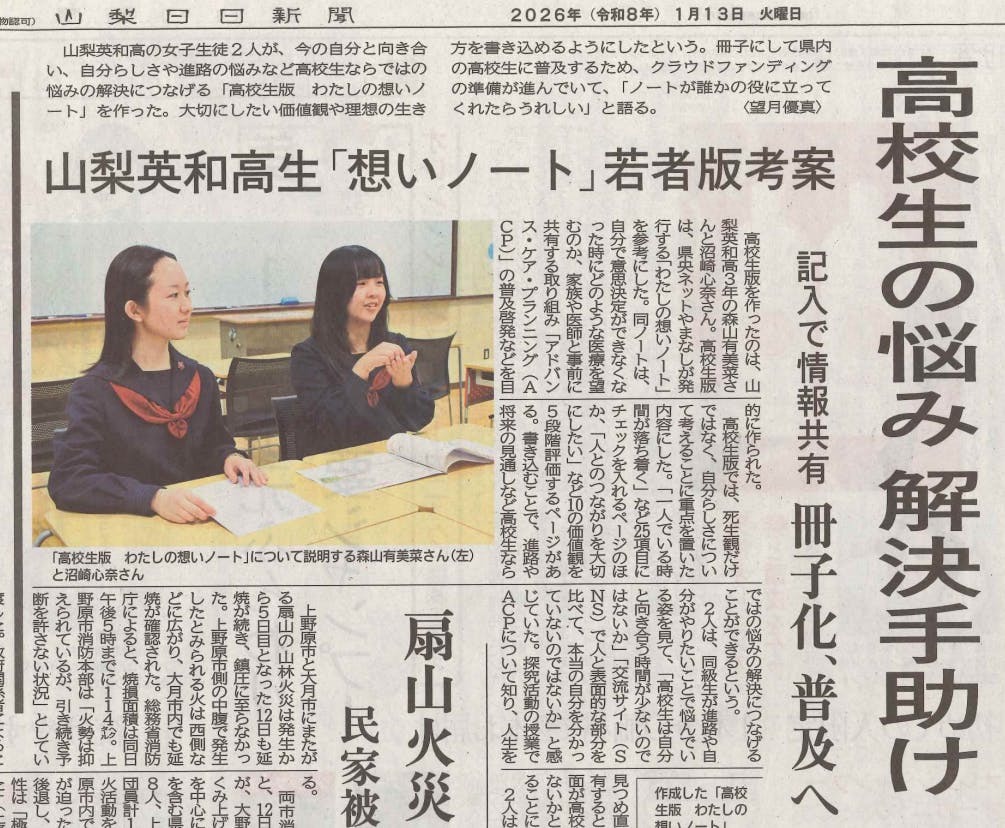 山梨英和高校、静岡英和高校、東洋英和高校、韓国の梨花女子高校の学生 477 名を対象に無記名によ る質問紙調査を行った。内容は、死に対する意識、身近な人との死生観の共有状況と価値観の把握状 況、ACP の認知度についてである。参加者は、各質問について6件法(1=全く当てはまらない;6= よく当てはまる)で回答した。また、山梨県内の終末期医療に関わる医療・行政関係者(医師、看護 師、行政職員等 計 5 名)にインタビュー調査を実施し、ACP の実際の運用や問題点について調査し た。また、実践活動として iACP が開発した「もしバナゲーム」を著者他 7 名が体験し、若者における ACP の意義を体感した。これらの活動から、高校生向けの「わたしの想いノート」という ACP の入り口 となるオリジナル冊子を作成し山梨英和の高校 1,2 年生に利用してもらい、感想と質問紙調査から若 年期における ACP の意義を検証した。