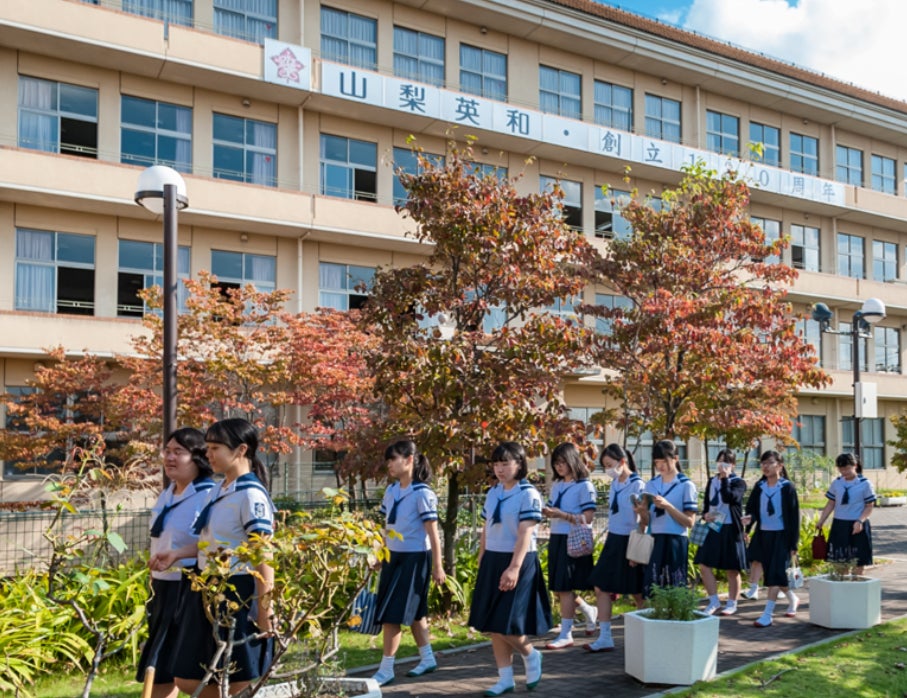 山梨英和高等学校は、1889年に設立された長い歴史を持つ学校です。校舎の裏手には、甲府市民にとって親しみのある愛宕山が、目の前には甲府市の中心地が広がっています。