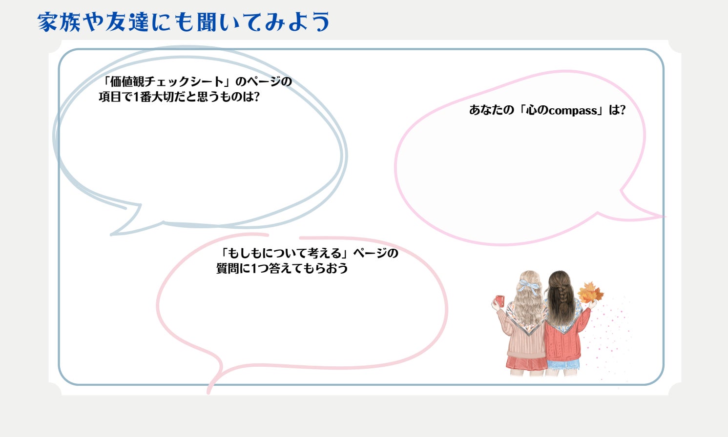 彼女たちは研究を進める中で自分自身の価値観を見つめ直し、それを誰かと共有するプロセスこそが、多感な時期を過ごす若者たちの「心の支え」や「生きる指針」になることを突き止めました。この研究成果を形にし、一人でも多くの仲間に届けたいという願いから生まれたのが、この「わたしの想いノート」です。 このノートは決して「もしも」に備えるためだけのものではありません。「自分は何に幸せを感じるか」「未来の自分へ何を伝えたいか」をノートに綴る時間は、自分を大切に慈しみ、明日を前向きに生きるための「自分へのエール」になります。