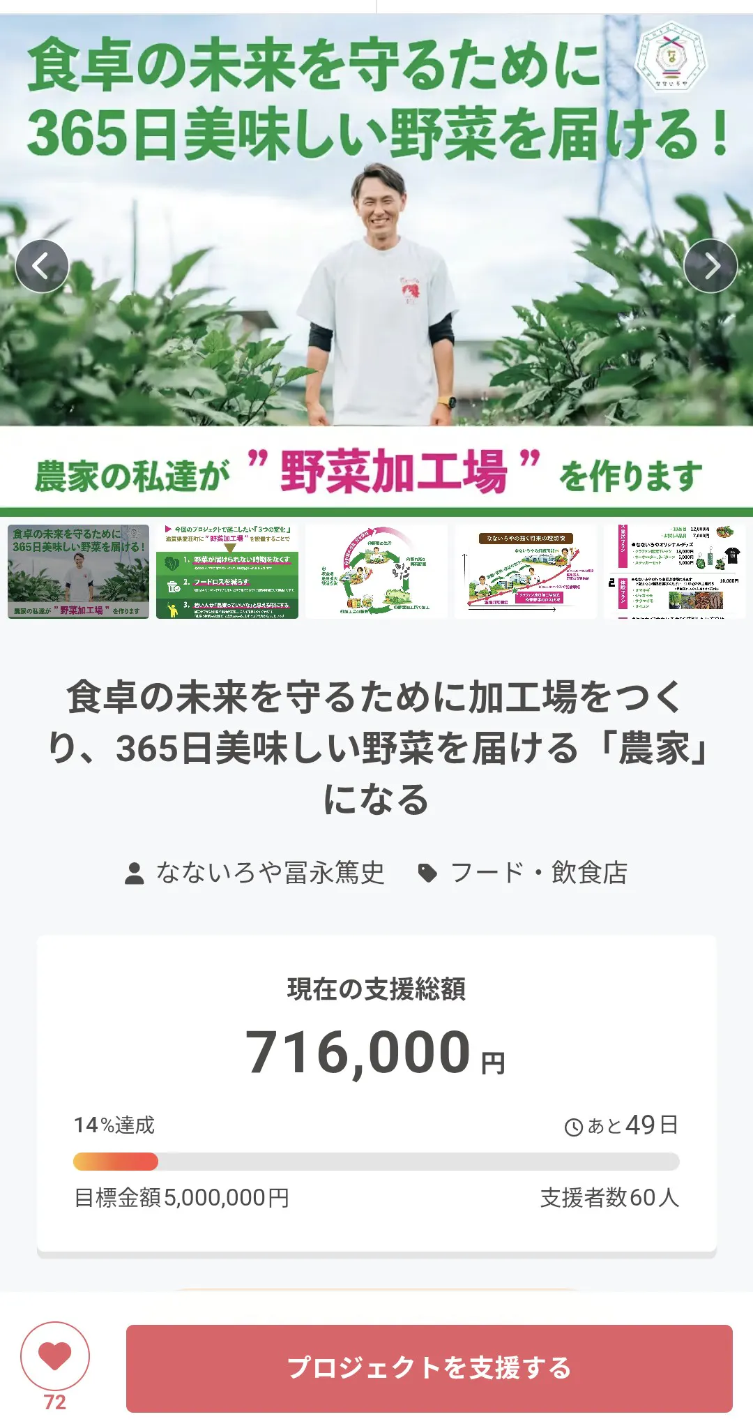60名方にご支援いただき、14%まで達成する事が出来ました!