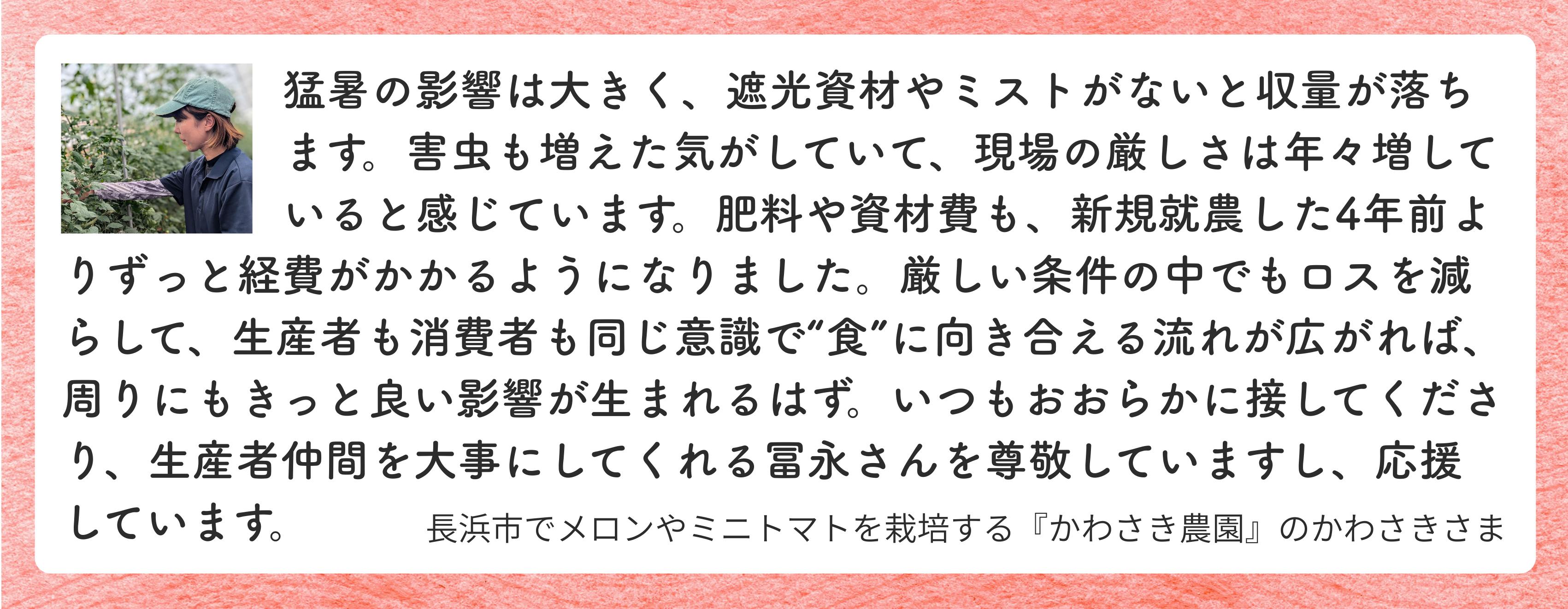 今回の挑戦は、ただ自分たちの売り上げを増やすためだけの行動ではありません。農家がムリなく続けられるやり方を自らの手でつくって見せること。それが、次世代に豊かな食文化を受け継ぎ、日本の食卓を守ることにつながると確信しています。