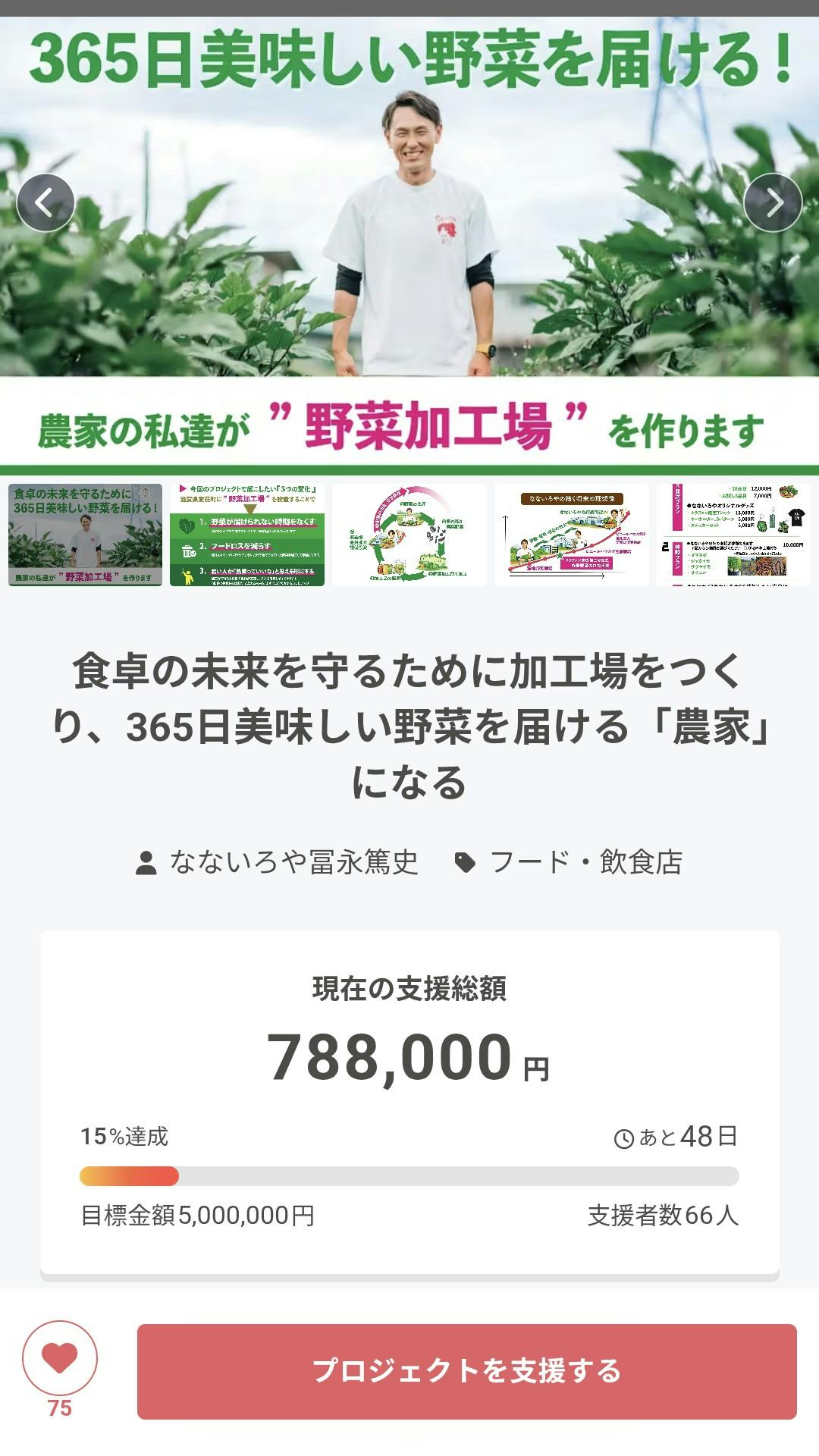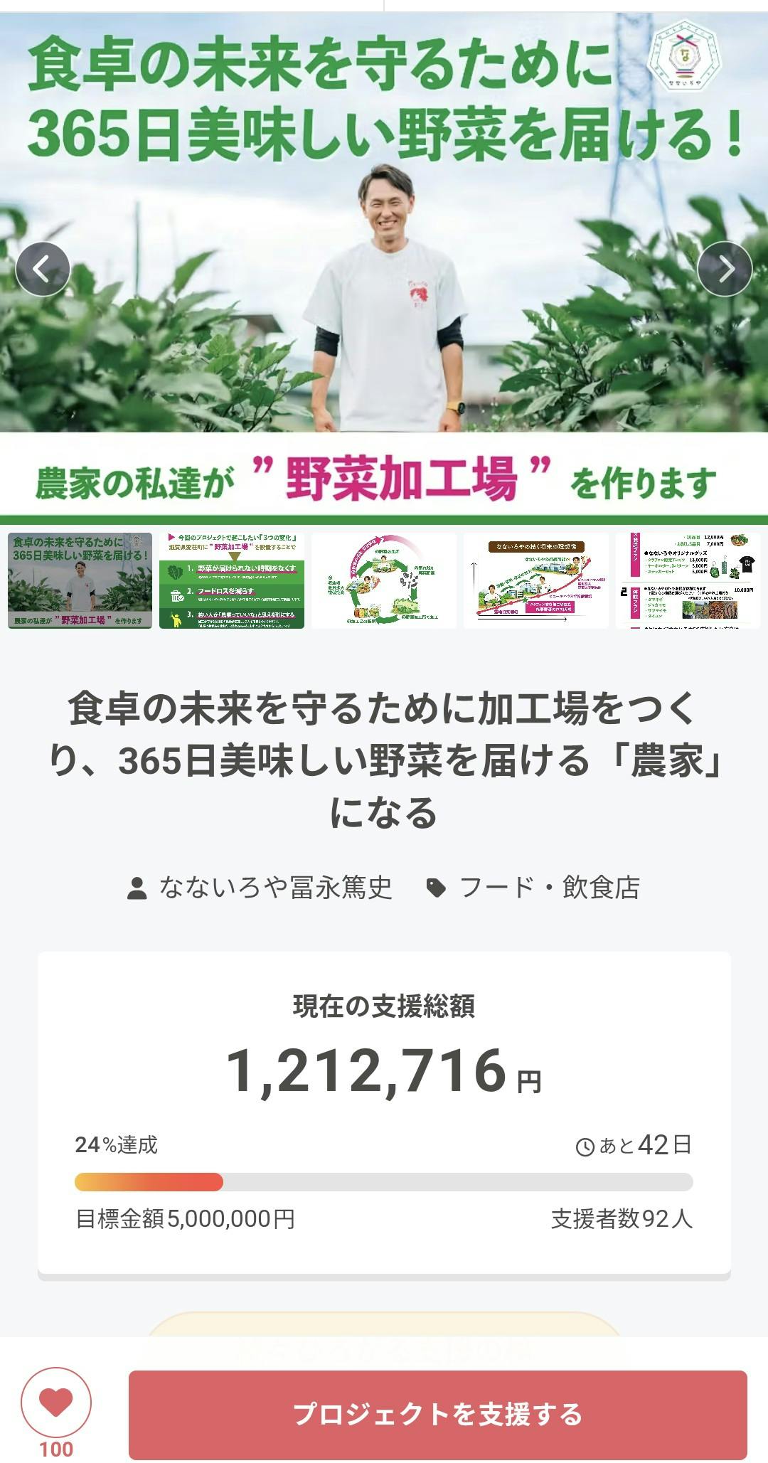 2026/02/10 07:01ご支援いただきありがとうございます!60名方にご支援いただき、14%まで達成する事が出来ました!ありがとうございます!今週は、冷凍野菜の試作もしに行く予定です。報告もしますのでお楽しみにー!あと49日、楽しみながら走り切ります! もっと見る