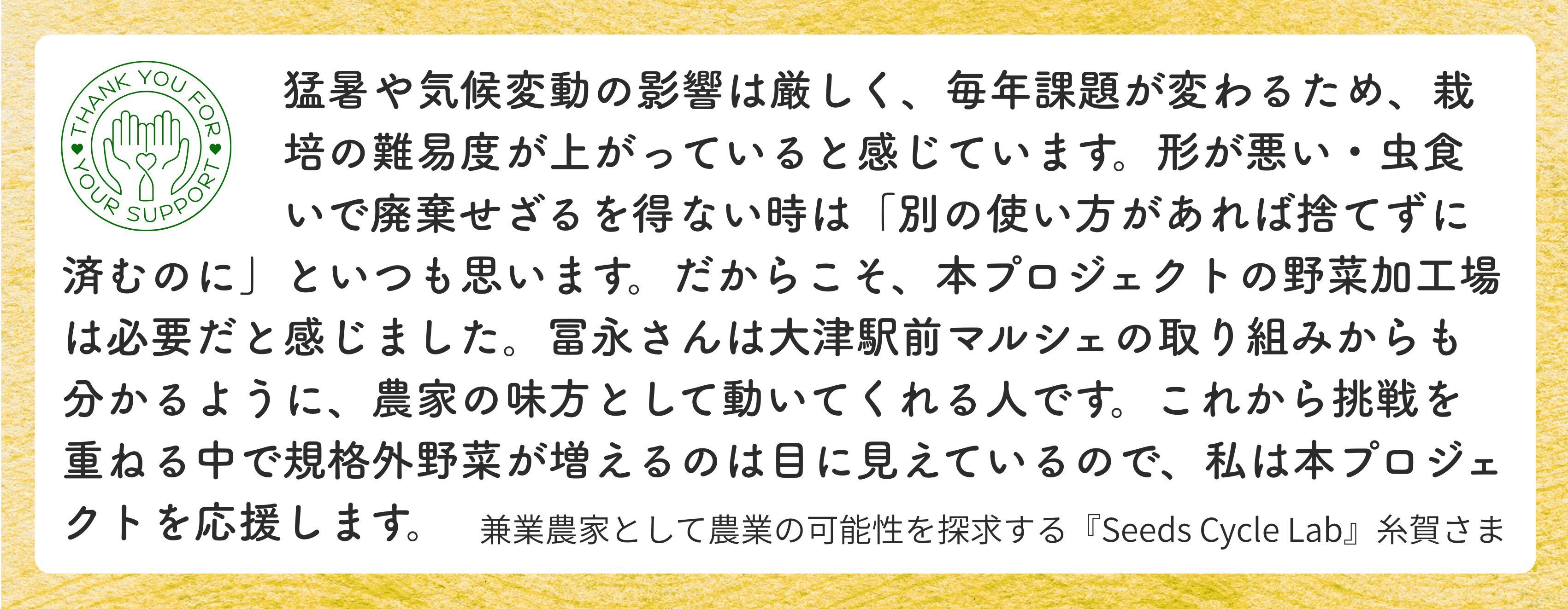 このプロジェクトで設置した加工場について、私たちのためだけに活用するつもりはありません。将来的には、滋賀県内の近隣の農家からも廃棄野菜や規格外野菜を仕入れて加工を請け負ったり、蓄積したノウハウを共有したりと、地域全体の農家の経営安定化を目指したいと思っています。