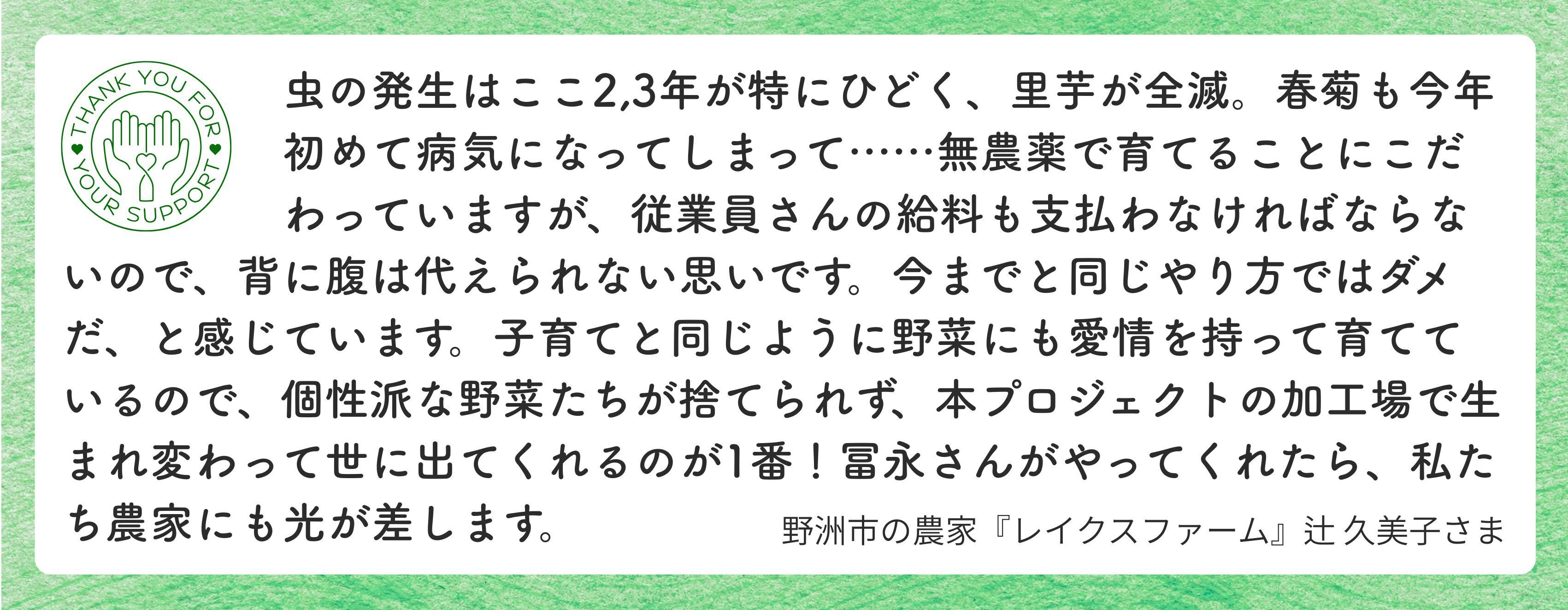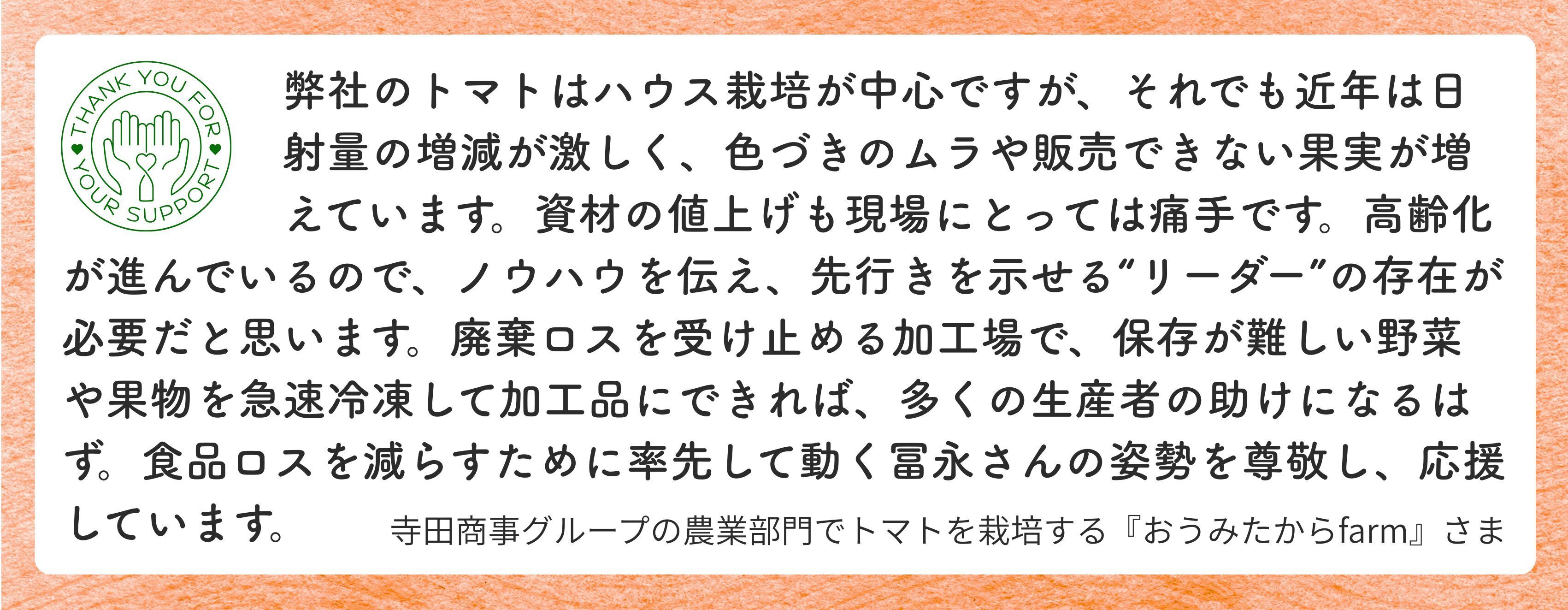 私たちは、みなさまからの支援を1円たりとも無駄にはしません。これからの食べものを守るための、大切な応援だと思っています。「どんな設備を入れたのか」「どれくらい野菜をムダにせずに済んだのか」など、SNSやYouTubeでわかりやすく報告していきます。