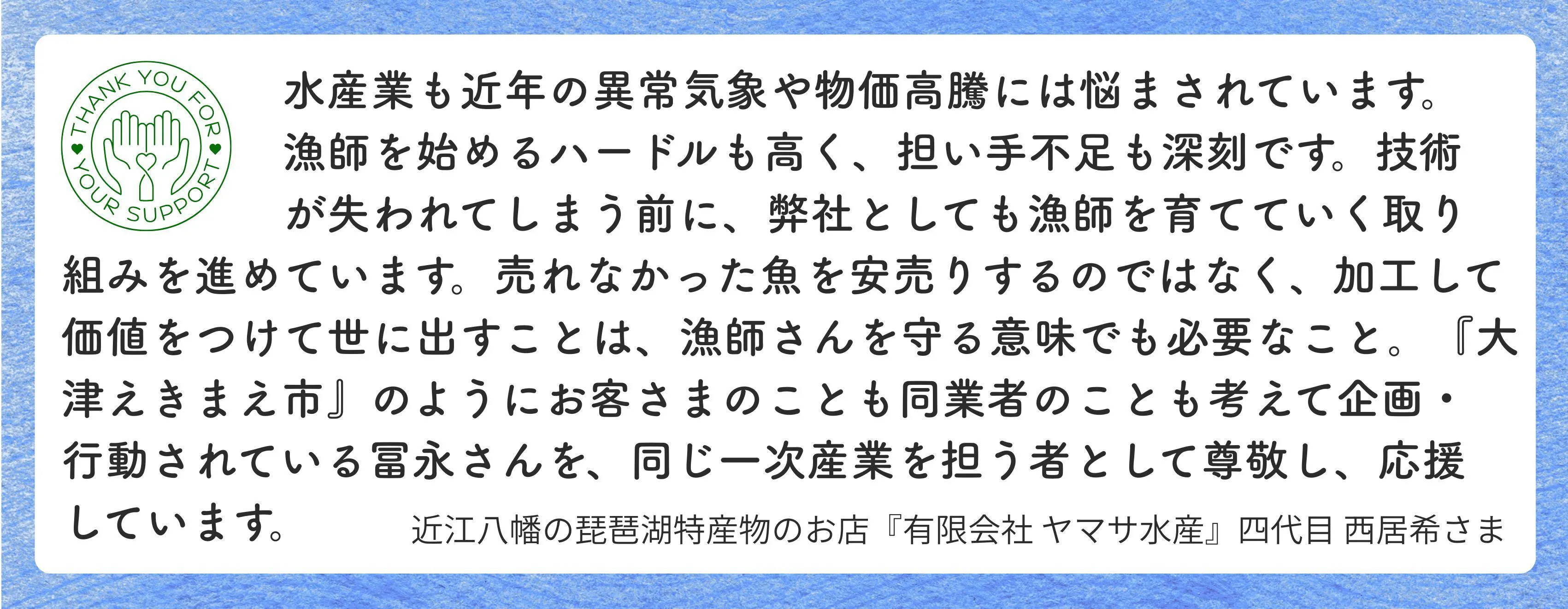 近江八幡市で湖魚販売、加工、または漁まで出られる【ヤマサ水産】西居 希さま