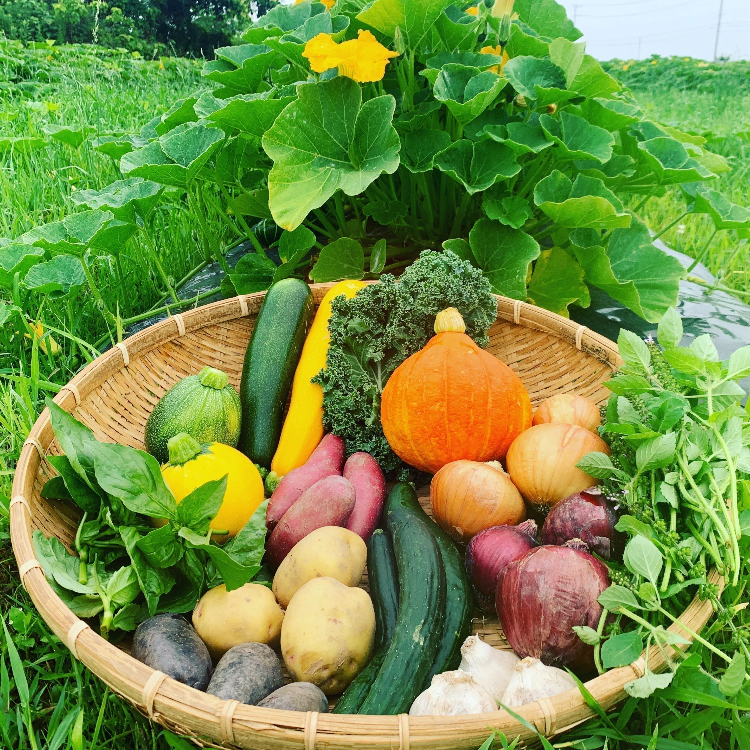 現在、1年間で育てている野菜は約30品目、100種類!こだわりの栽培方法で、サラダでも食べれるカリーノケール茎を食べるブロッコリートロっとする白ナス粘りの強い味わいのあるオクラ、など食卓が楽しくなるような色とりどりの野菜づくりを心がけています。