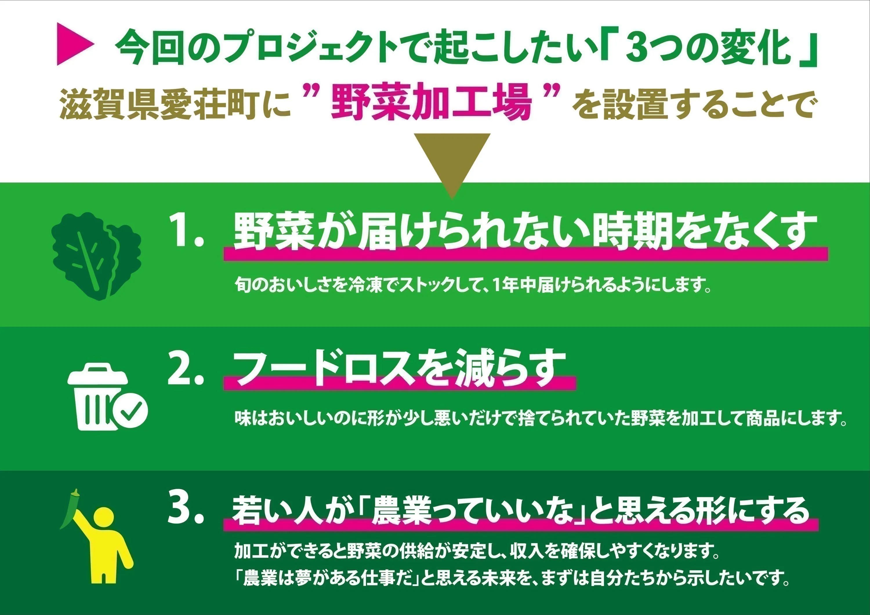 【野菜加工場】の設立により、以下の3つを叶えたいと考えています。