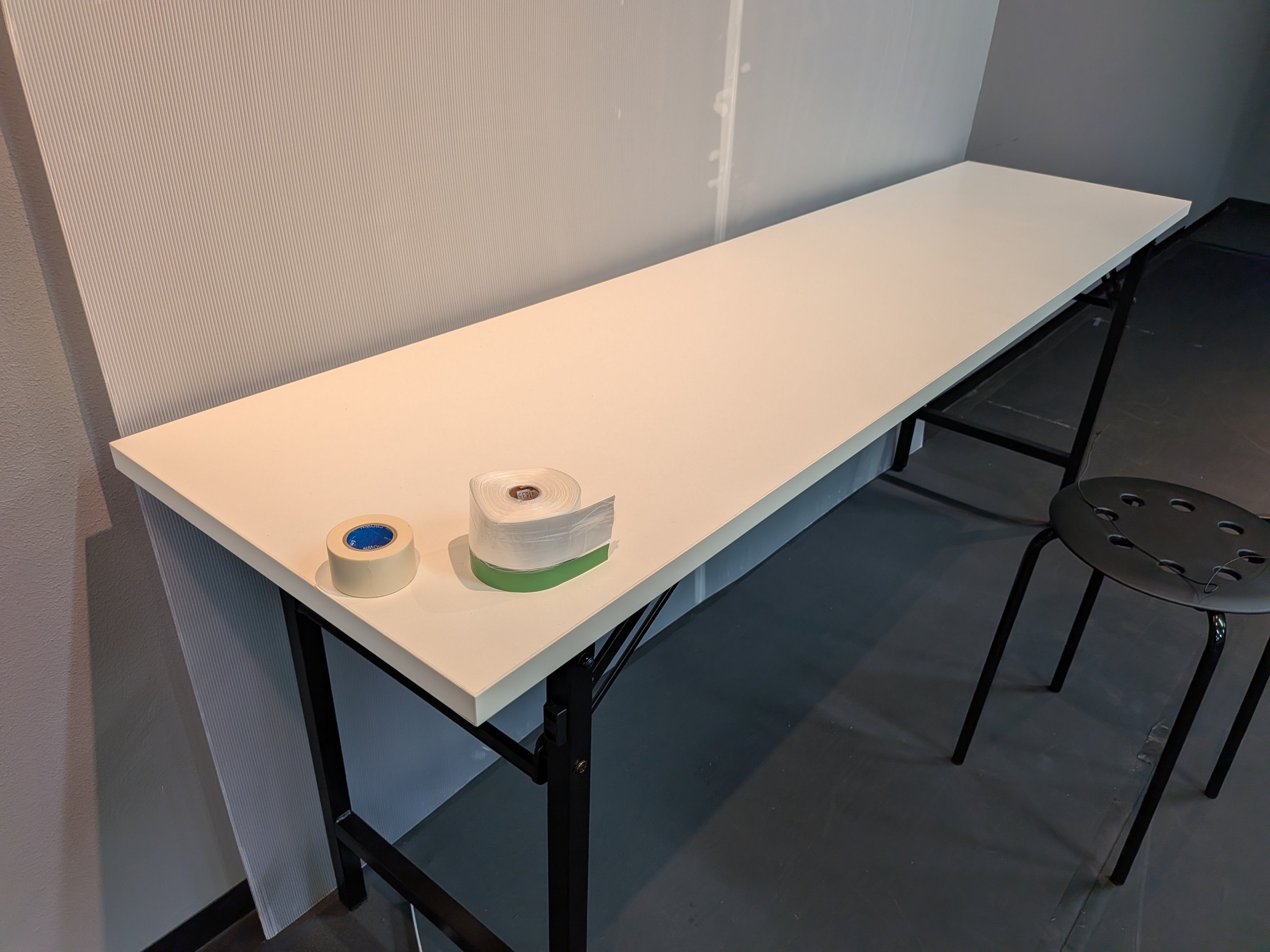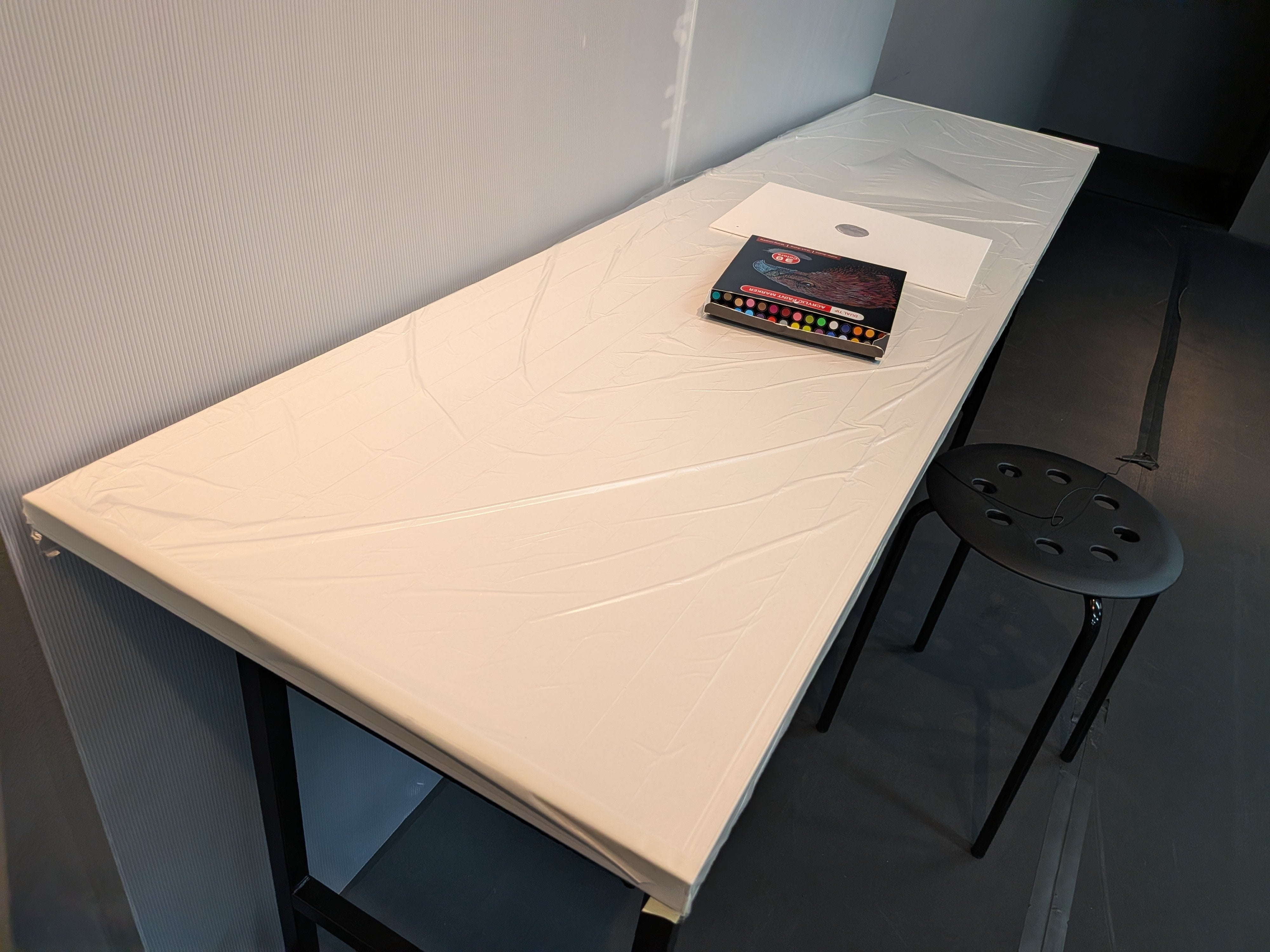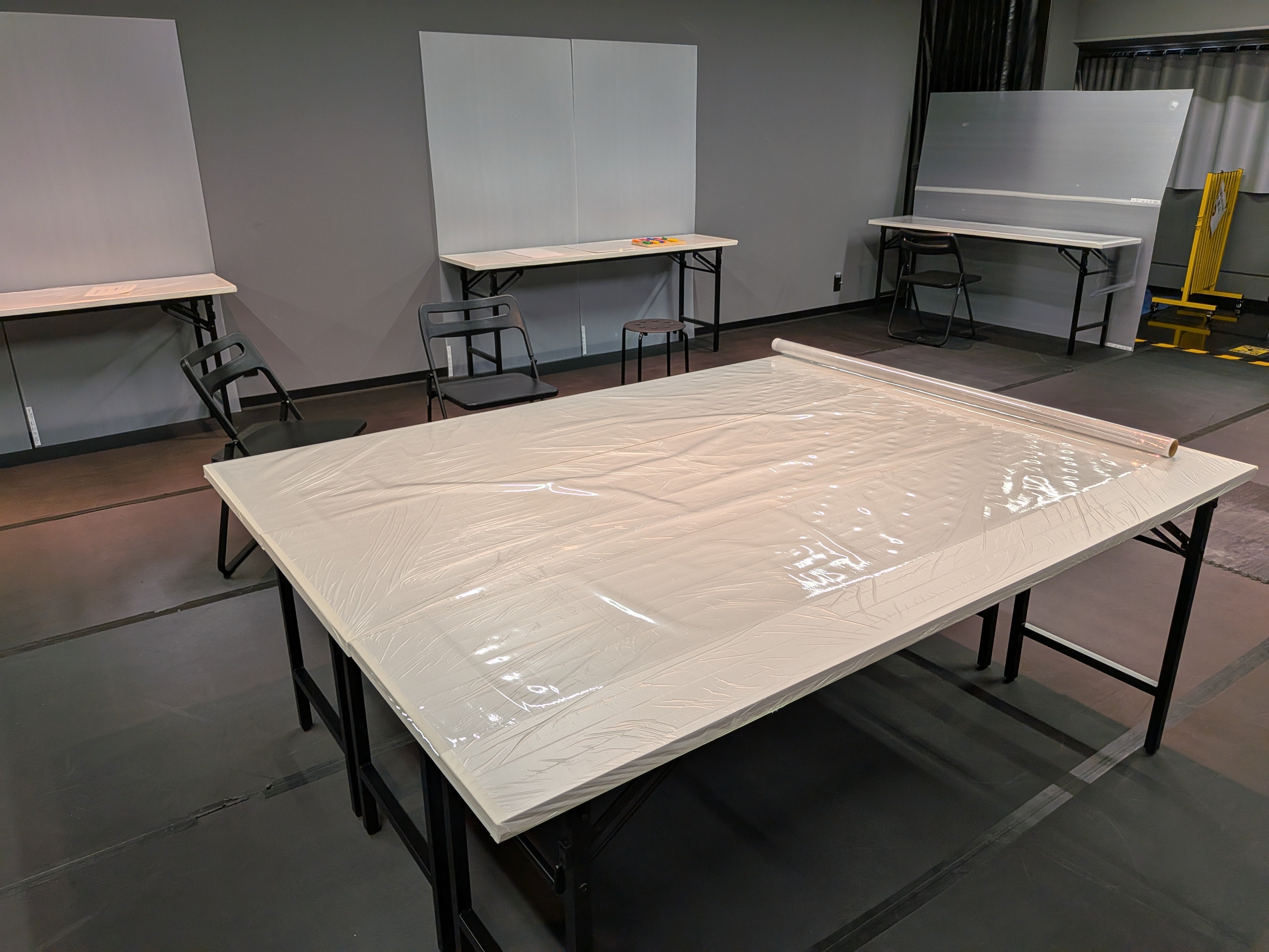 皆さんに安心して絵を描いていただけるように、机にシートを貼り貼り