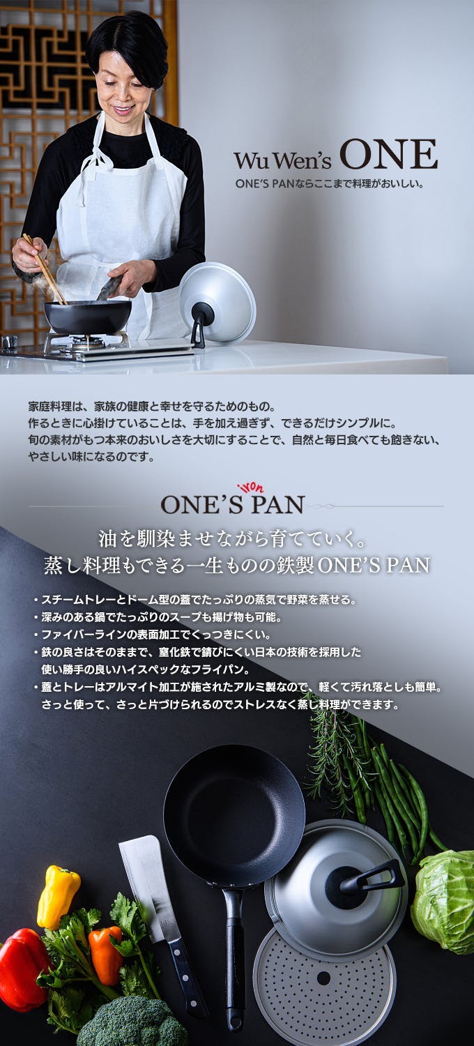 中国家庭料理研究家 ウー・ウェンの想いをカタチにした多機能フライパン。北陸アルミニウム(富山県高岡)と試行錯誤を重ね「蒸炒鍋」として誕生したのが2007年。そしてこの度、素材も新たに「ONE'S PAN蒸炒鍋」が完成しました。