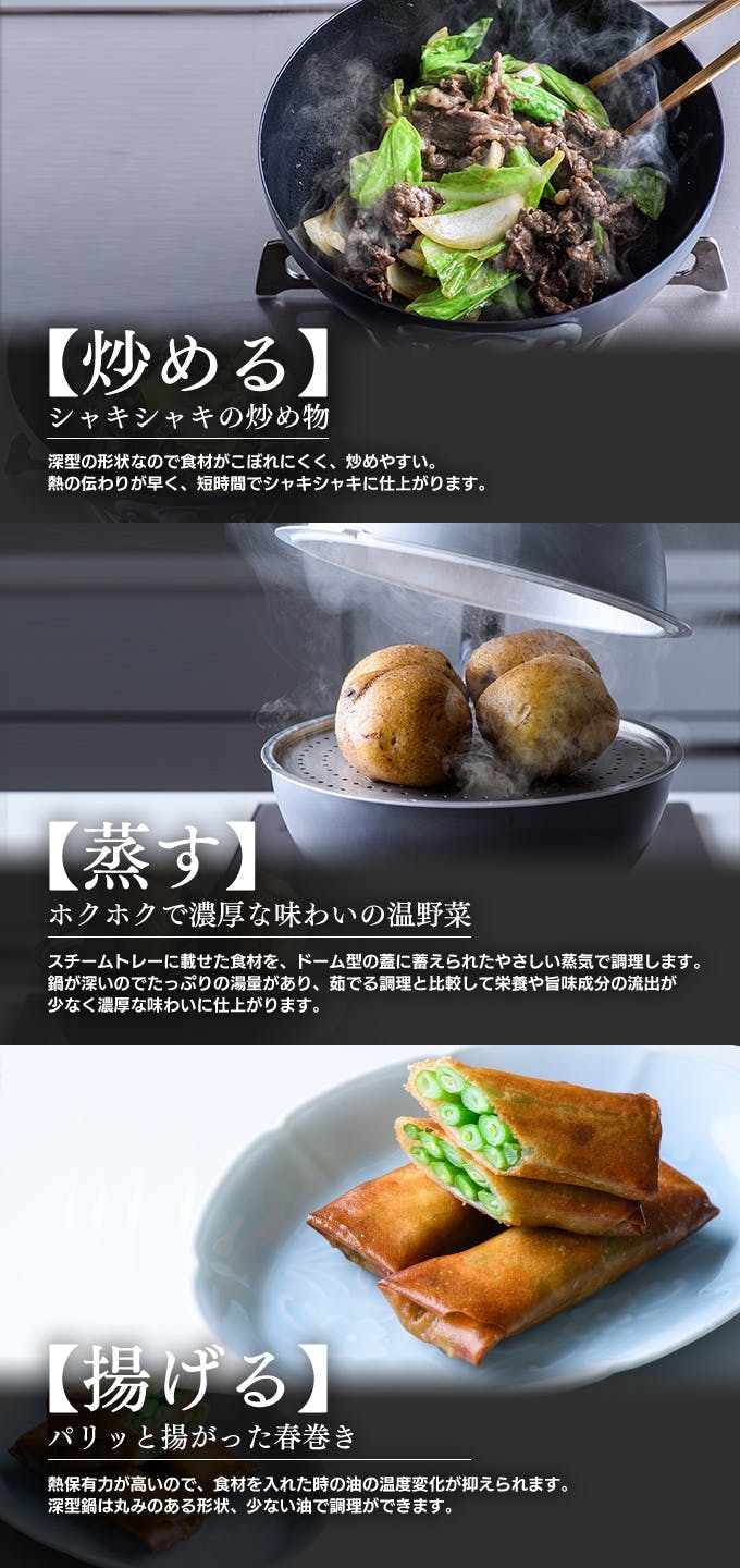炒めることはもちろん、麺を茹でたり、じゃが芋を蒸したり、餃子を焼く、根菜を揚げたり、野菜や肉をやわらかく煮ることも、ONE'S PAN蒸炒鍋で美味しくできます。