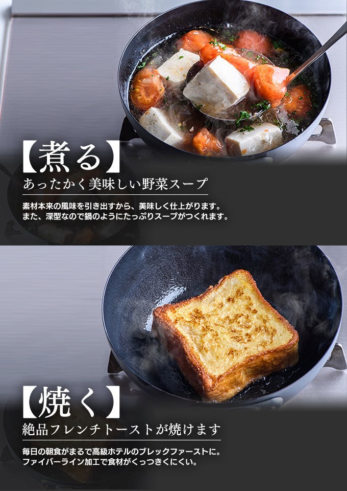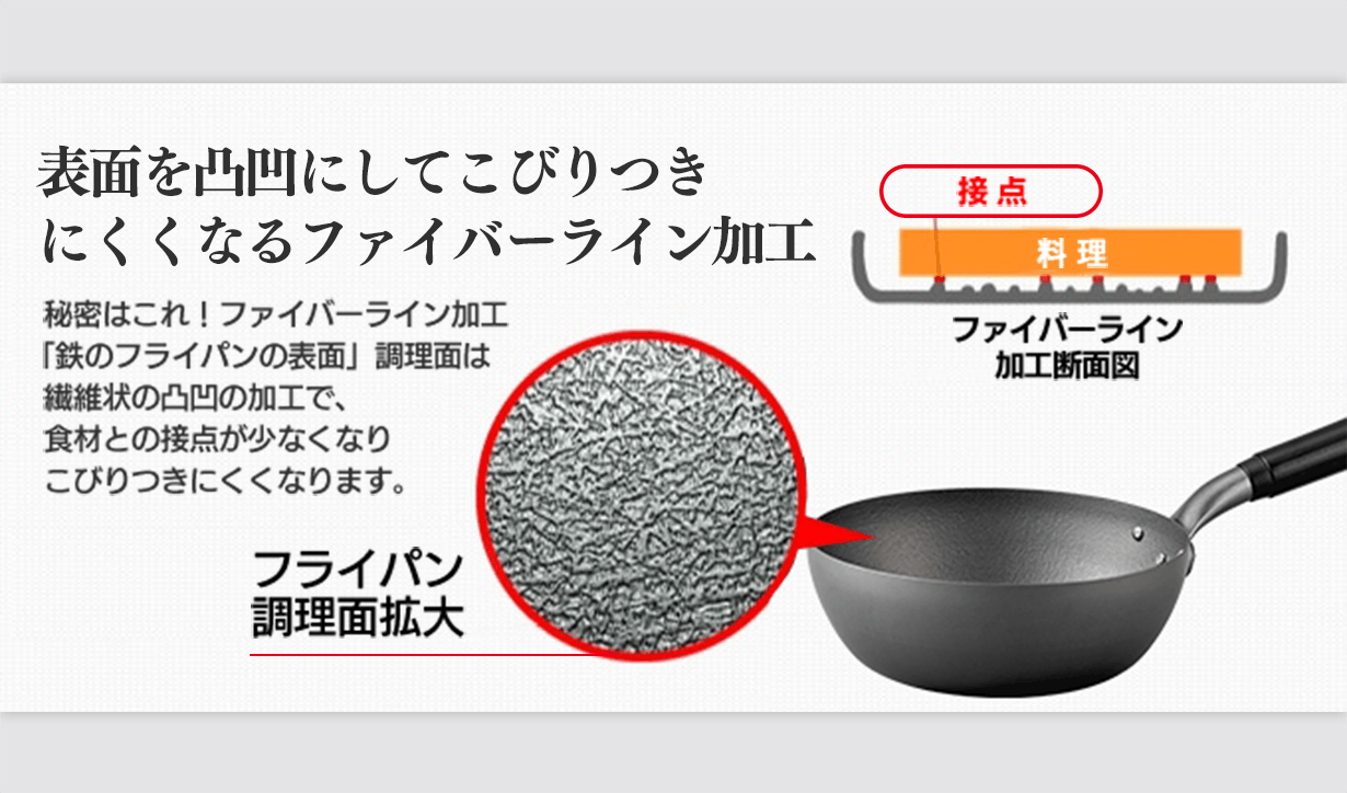 この加工により油なじみが良くなり、食材との接点を少なくすることで、こびり付きにくさを実現しています。