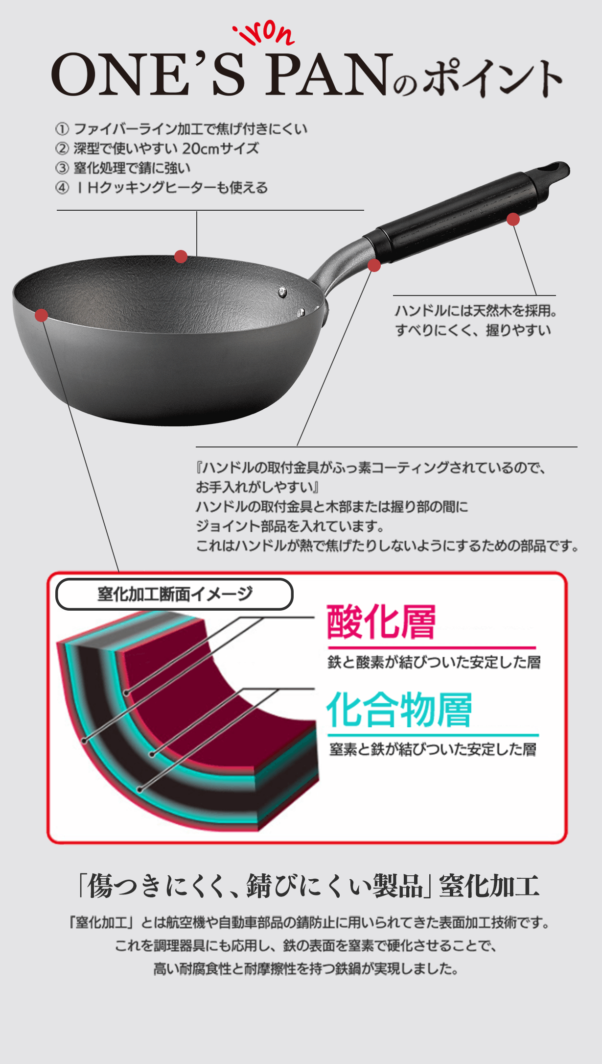 一般的な鉄製フライパンと比較して、とても錆びにくい「窒化加工」を施しました。コーティングと違い、剥がれる心配がありません。
