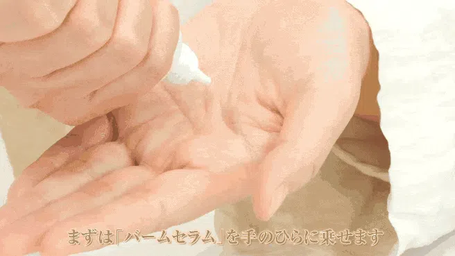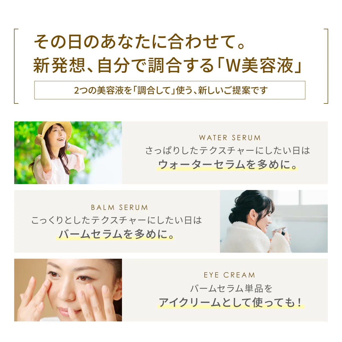 油分を与える美容液<バームセラム>と水分を与える美容液<ウォーターセラム>を、ご自身で混ぜ合わせ、乳化したてのフレッシュな美容液をマッサージするようにお肌に馴染ませてください。