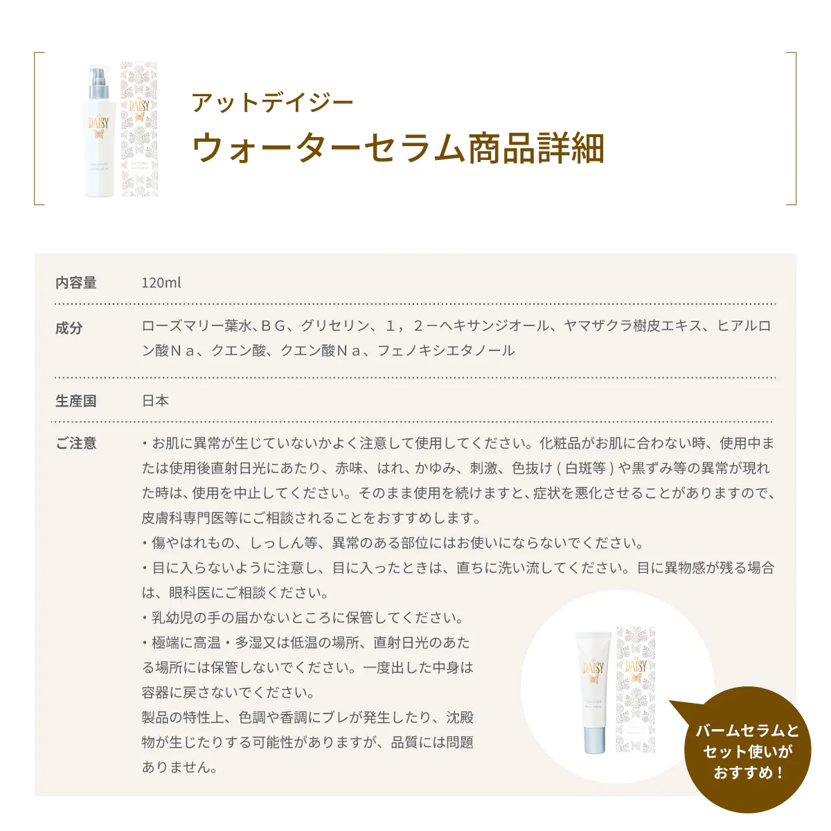 商品の良さを感じて頂くためにもatDAISYウォーターセラムと一緒に使って頂くことをおすすめいたします。