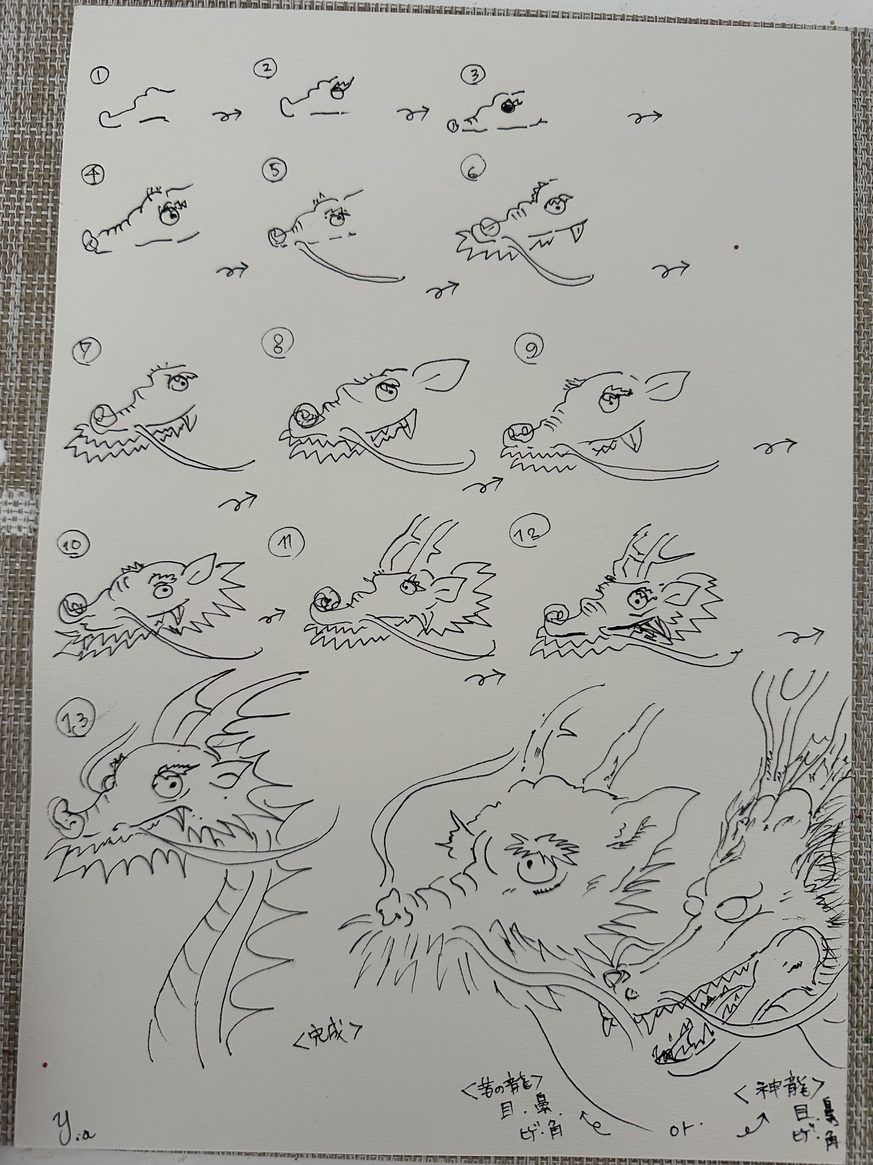 たとえば「龍を描きたい」と言われたら、いきなり描かせることはしません。龍の描き順を1から8まで分解し、薄いペーパーに写してガイドを作ってあげます。「この通りに描いてみて」と具体的に示すことで、まずは私とまったく同じ絵が描けるようにする。その体験が、「自分が描いているみたいじゃない!」という驚きと、自信につながっていきます。