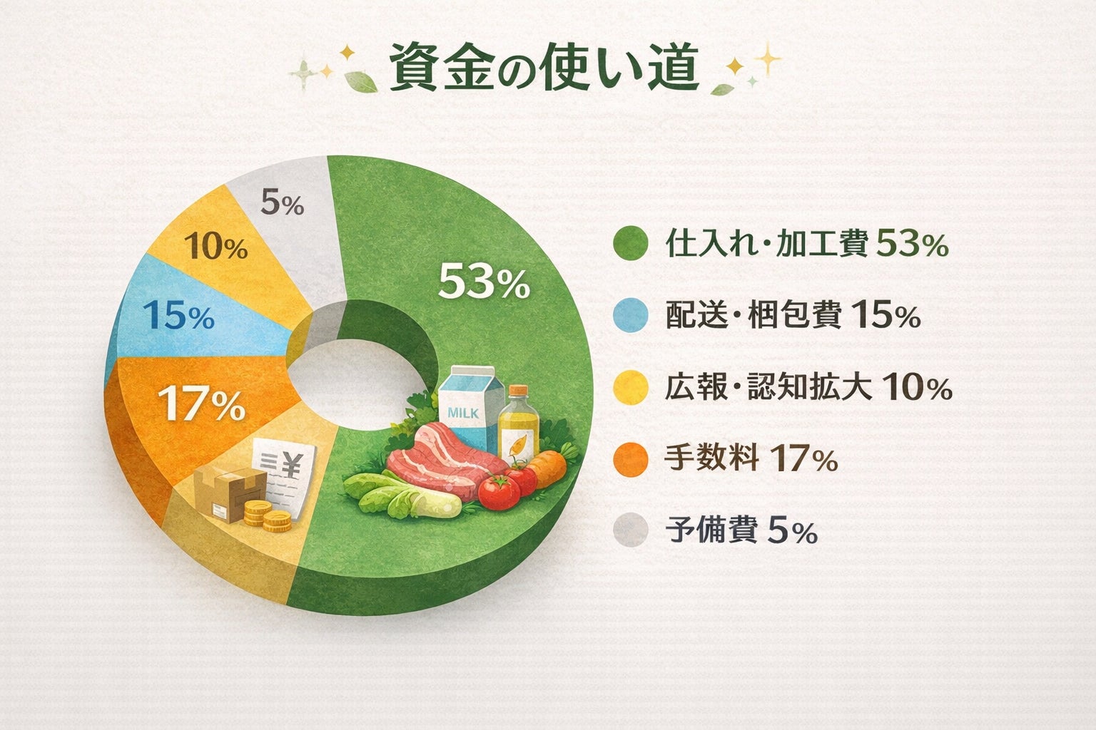 支援者のみなさまからいただいたお金の大半(53%)は、THE HOUBOQ 代表 増田さんへの仕入れ・加工費として直接還元されます。このプロジェクトの収益の一部は、放牧豚の生産体制拡充と、アニマルウェルフェア認証の普及活動に使われます。