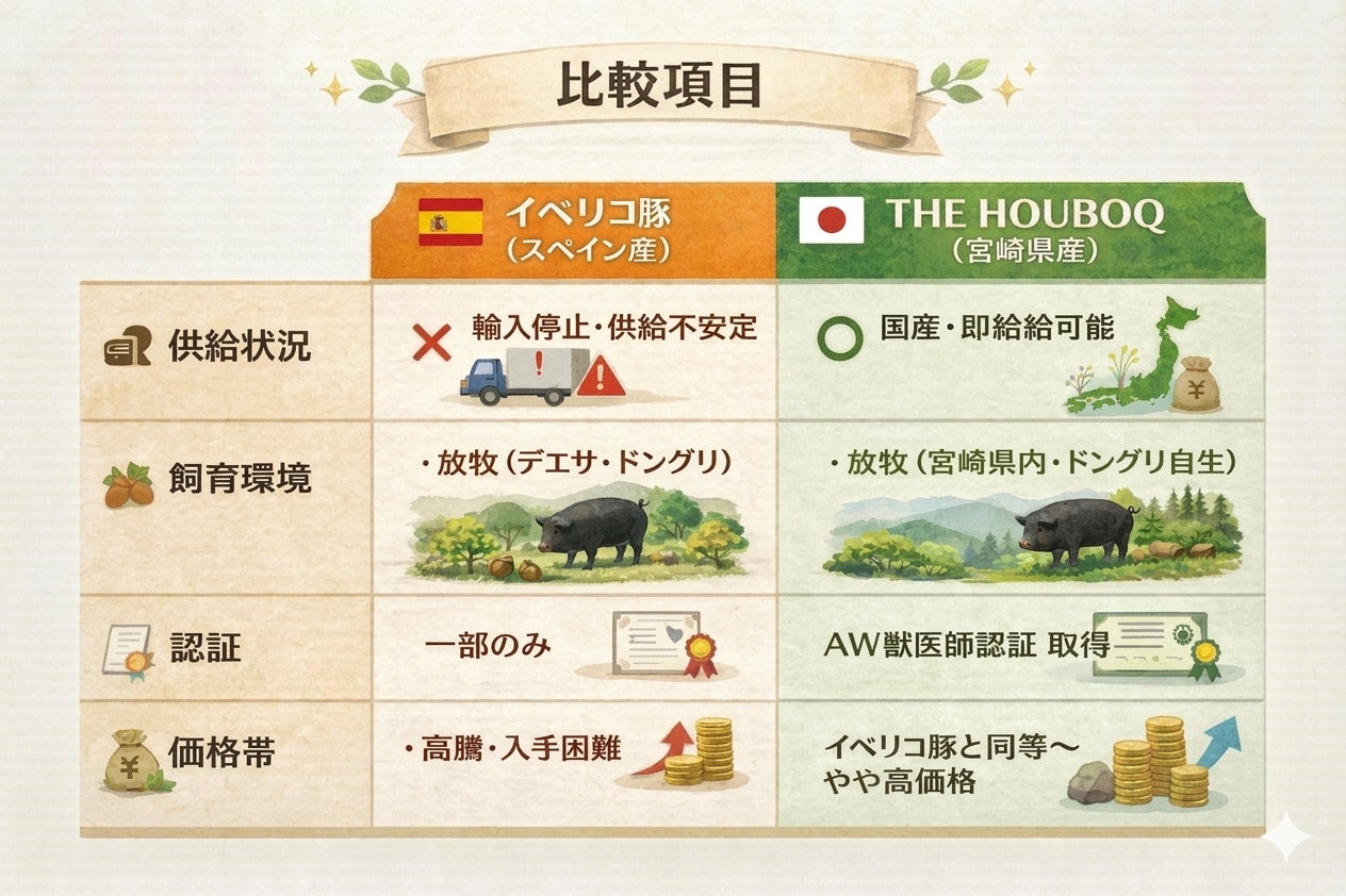▼ スペイン産イベリコ豚 vs 宮崎産 THE HOUBOQ の比較