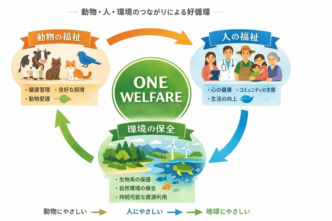 つまり、動物に良いことは人にも良く、さらに地球にも良い影響を与えるという、三者が支え合う“ひとつの循環”のような考え方なのです。動物・人・環境を分けて考えるのではなく、全部がつながった一つの世界(One World)としてとらえ、その調和を大切にしようというのが、ワンウェルフェアの核心です。