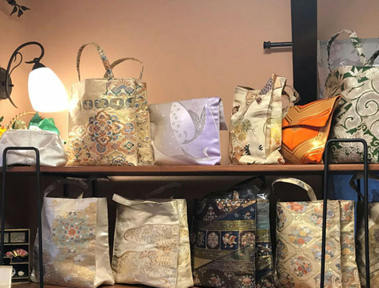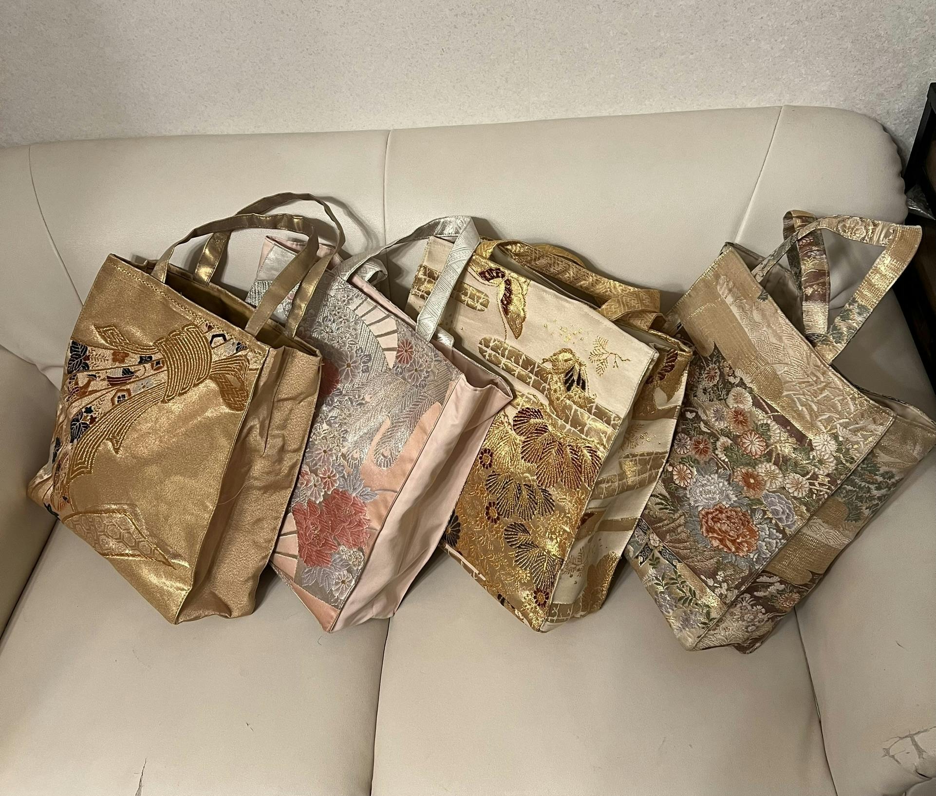 若いころの帯や式服用の帯など袋帯はもう締めることもないしほとんど使ってないのでバッグにリメイクしてみたらとても重宝したのでいくつか作ってみました。色々なサイズを試して究極のバッグをデザインしましたのでご自分の勝負バッグとしてお作りできると嬉しいです。