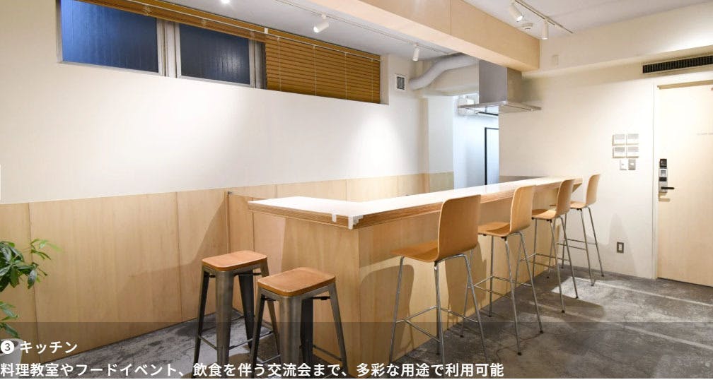 中地下にはキッチンカウンター付きのスペースがあり、軽いお食事やお茶を楽しんでいただくことができます。前回この会場で開催されたマルシェでは、ハーブを扱う店舗が出店されていた実績もあり、落ち着いて過ごせる心地よい場所です。