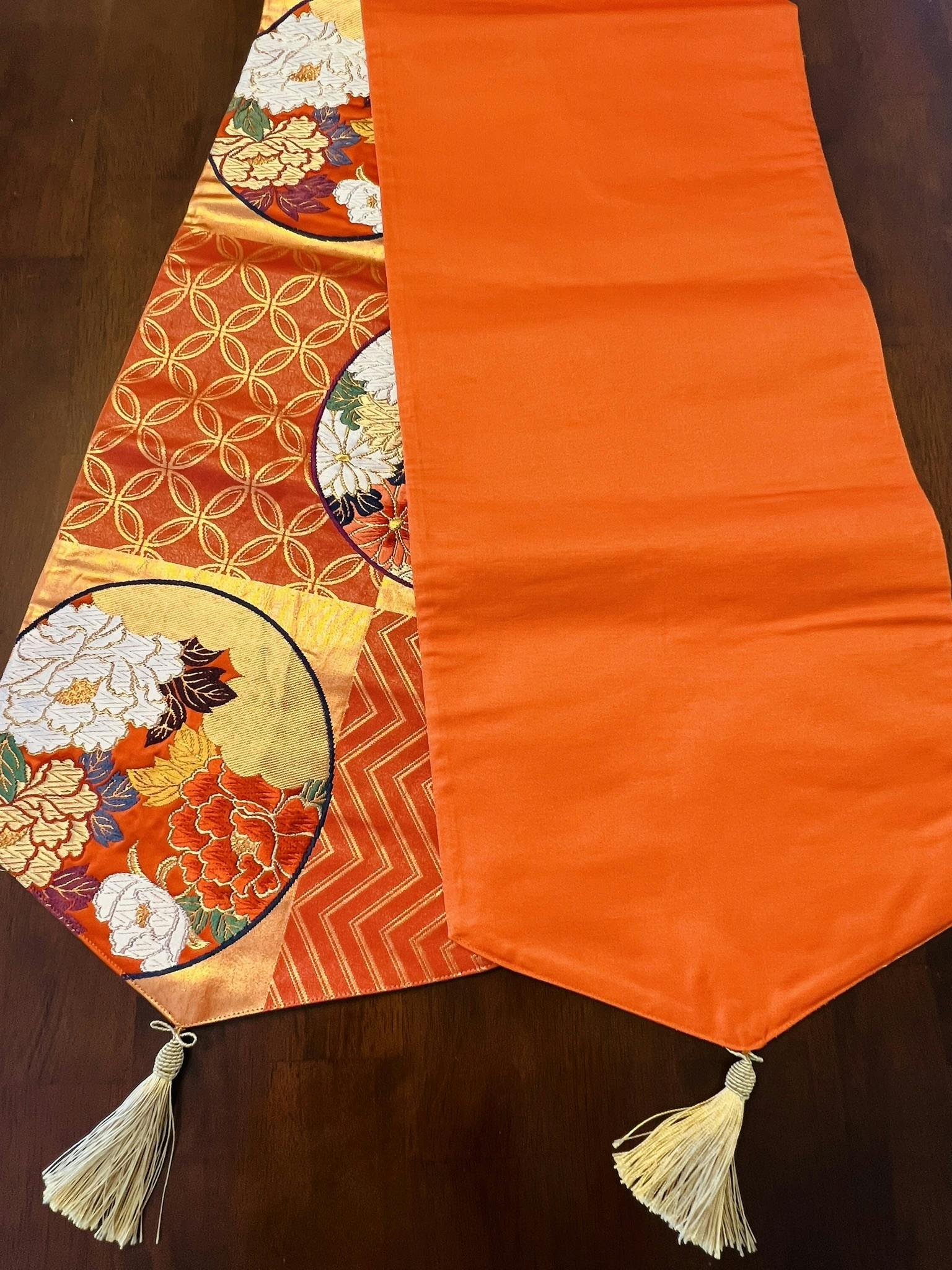 ・帯を使ったテーブルランナーです。和の空間づくりにおすすめです。帯をリメイクして仕立てた、1点ものが作れます。