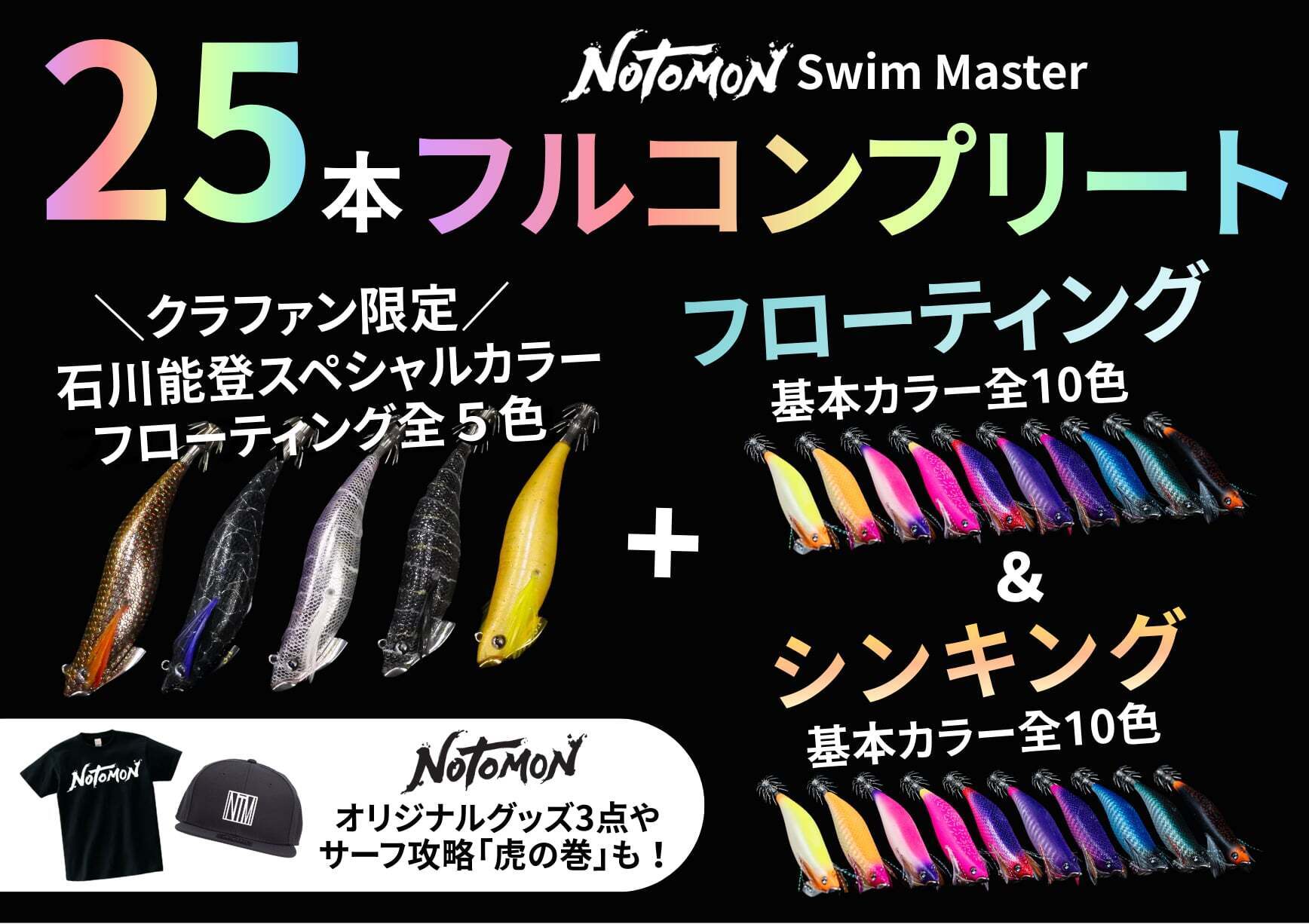 「能登発!『投げて巻くだけイカが釣れる』キャスト専用エギを届けたい!」プロジェクトオーナーの北出 弘紀です。1月17日〜19日にパシフィコ横浜で開催されたフィッシングイベント『釣りフェス2026』にNOTOMONとして出展してきました。この度、初の出展となったNOTOMONブースに足を運んで頂いた皆様に、この場をお借りし心より感謝申し上げます。例年、この時期に開催されている国内で最初の釣りイベントですが、今年の来場者は昨年の約10%増し、3日間で約38,000人の来場者だったと報告を受けています。過去には別のメーカーとして何度か出展経験はありますが、コロナ前を含めても、ここ10年で一番盛り上がったイベントだったのではないかと感じています。そんな中での出展ではありましたが、「能登発信の釣りブランド」にどのくらいの人が集まってくれるのか?クラファンのスタート前もそうでしたが、この釣りフェスにおいてもサーフエギングという特殊な釣りスタイルで、しかも前代未聞のフローティングエギに、いったいどれだけの人から関心を寄せてもらえるのか、不安な中でのスタートでした。クラファンでは想像を遥かに超えるスピードで目標金額を達成し、コメント欄でもサーフエギングを楽しんでいる人が意外に多いことが判明しました。そしてこの度の釣りフェスにおいても、多くのサーフエギング実践者の方々にご訪問を頂いたことは、本当に驚きでした。すでにクラファンで応援を頂いている支援者の方にも複数ご来場を頂き、直接お話をさせて頂いたり、お礼を述べさせて頂けたことは本当にありがたかったです。来場者の中には、以前からサーフエギングを楽しんでおられた方、エギを自らチューニングしてシャロー帯を狙っている人、巻きの釣りに適した動きになるよう工夫されている釣り人、北は東北、南は沖縄まで、日本の東西を問わず全国にサーフエギング愛好者がいること、そんな方々に釣りフェスのブースに訪れて頂けたことは、この釣りの潜在的なポテンシャルの大きさを表していると実感しています。NOTOMON Swim Masterをご支援頂いた皆様には、この秋に能登半島のサーフで、実際のフィールドでどのような使い方をするかのワークショップのようなイベントを開催したいと強く思っておりますが、それと同時に、すでにサーフエギングを実践している全国の方々が能登の地に集まり「サーフエギングミーティング」のような情報交換会ができたら、凄いことになるのではないか…会場でサーフエギングファンの皆さんとお話をしているうちに、イベントの更なる方向性が見えてきて、これは間違いなく面白いイベントになると確信!夢は膨らむばかりです!このようなスペシャルイベントを秋に能登半島で実現するためにも、ネクストゴールの達成に向け、最後のリターンをご用意させて頂きます。全体のリターンの中で最も人気があり、最初に売り切れてしまったNOTOMON Swim Master 3.1 のフローティングエギ、クラファン限定の5色と基本カラー全10色の合計15本、これにTシャツ、ステッカーと虎の巻で30,000円のセット。これになんと、シンキングのプロトタイプ基本全10色を追加し、合計25本のNOTOMON Swim Master 3.1 フルコンプリートセットを50,000円で20セットご用意させて頂きます。付属アイテムとしてオリジナルTシャツ(サイズはS,M,Lから選べますがカラーはブラックのみ)、ステッカー、サーフエギング虎の巻、これにオリジナルフラットキャップ(カラーはブラックのみ)もおつけ致します。シンキングタイプは秋イカのシーズンに間に合わせる予定で進行している都合上、まだ最終の仕様決めが現時点で完了していないため、シンキングに関しては最終の商品と多少の重量差がある可能性がございます。仕上げは量産品と同じで、パッケージにも入っておりますが、シンカーの部分が最終的に販売されるものと少し違う可能性があるため『プロトタイプ』ということでご理解を頂きたいと存じます。シンキングタイプのスペックですが、アクションはフローティングと同じS字軌道、重量は今のことろ約19gで、沈下速度は4秒/mを目指したものになります。ネクストゴールを達成すための最後のスペシャルリターン、詳細はプロジェクトのリターン詳細をご確認ください!1月7日にスタートしたこのプロジェクトですが、いよいよ今月末31日に終了を迎えます。終了まで10日を切りましたが、ネクストゴール目指して最後まで走り抜けたいと思っておりますので、どうか皆様方のさらなるご支援、ご協力をお願い致します!