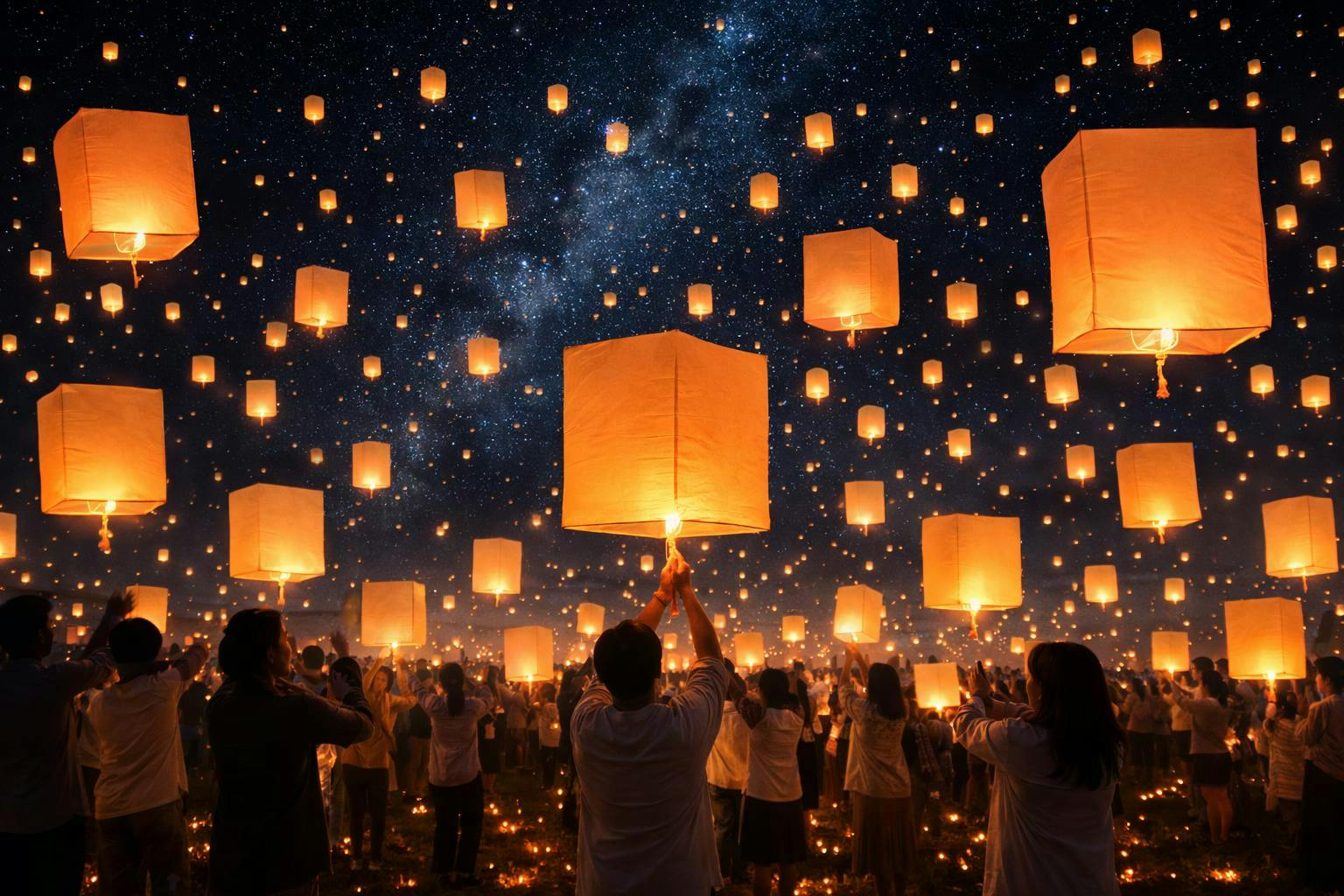 あたたかな光に包まれながら、一斉に夜空へ打ち上げます。