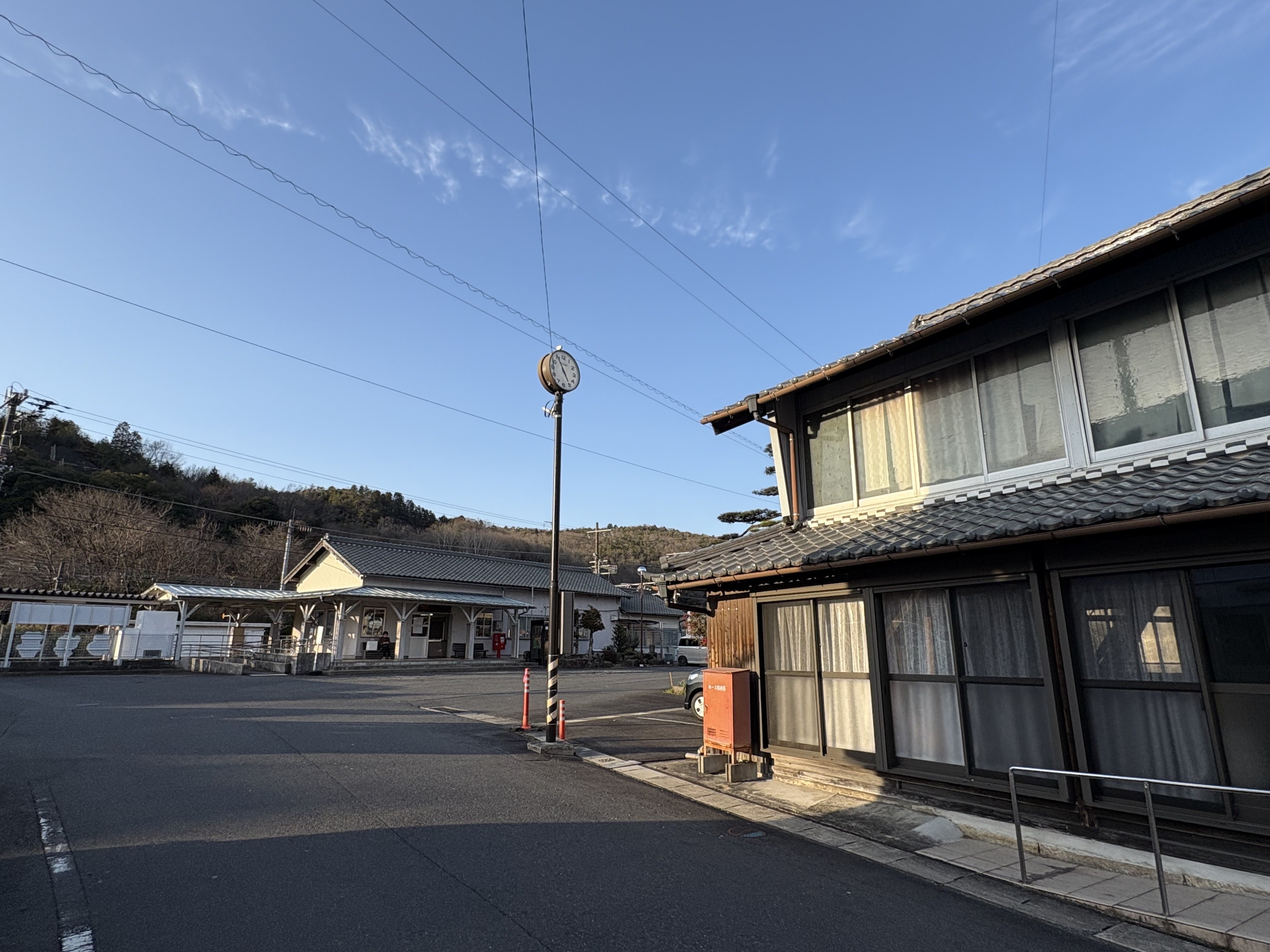 奥が釜戸駅、手前右側が駅前古民家の建物です。