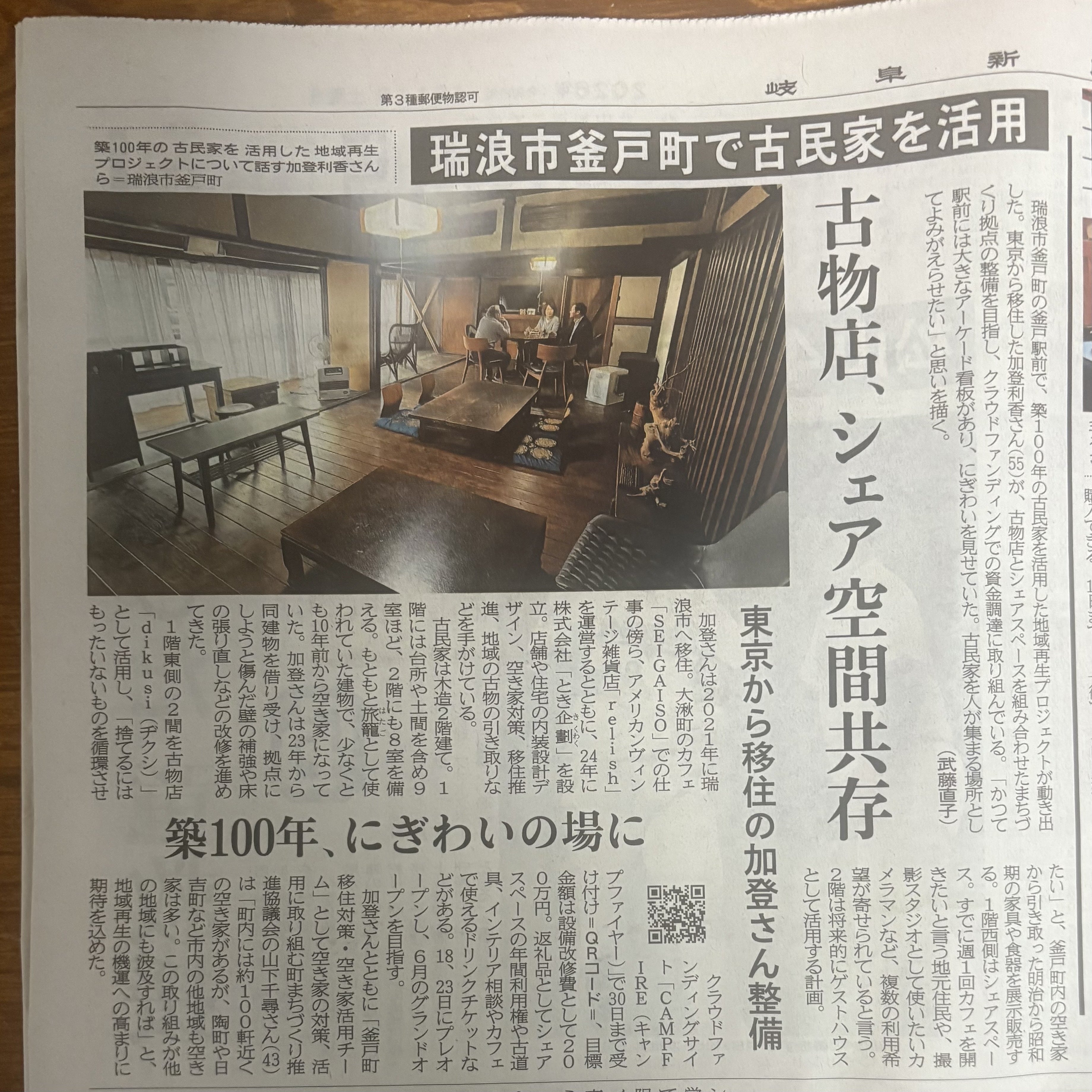 2026/04/12 08:004月11日の「岐阜新聞」16面の東濃地域の誌面に、今回のクラウドファンディングのプロジェクトが掲載されました。準備中の釜戸駅前古民家にて、釜戸の「空家活用・移住推進チーム」のお二方にも来ていただき、今回の経緯やチームのこれまでの活動などについてなど、話をさせていただきました。私が東京から瑞浪に移住したのが2021年。釜戸空家活用・移住推進チームが発足したのが2022年。釜戸駅前の古民家をお借りすることになったのが2023年。別の件で空家活用移住推進チームにお世話になったのがまず最初のきっかけですが、ここに至ったことについて改めて振り返ることができました。今年はさらに、空き家チームが中心となり、駅前周辺にある空き家・空き店舗を活用したイベントを秋頃に開催する計画をしています。ますます楽しみな釜戸のまちづくり。今後の動きにもどうぞご注目ください! もっと見る
