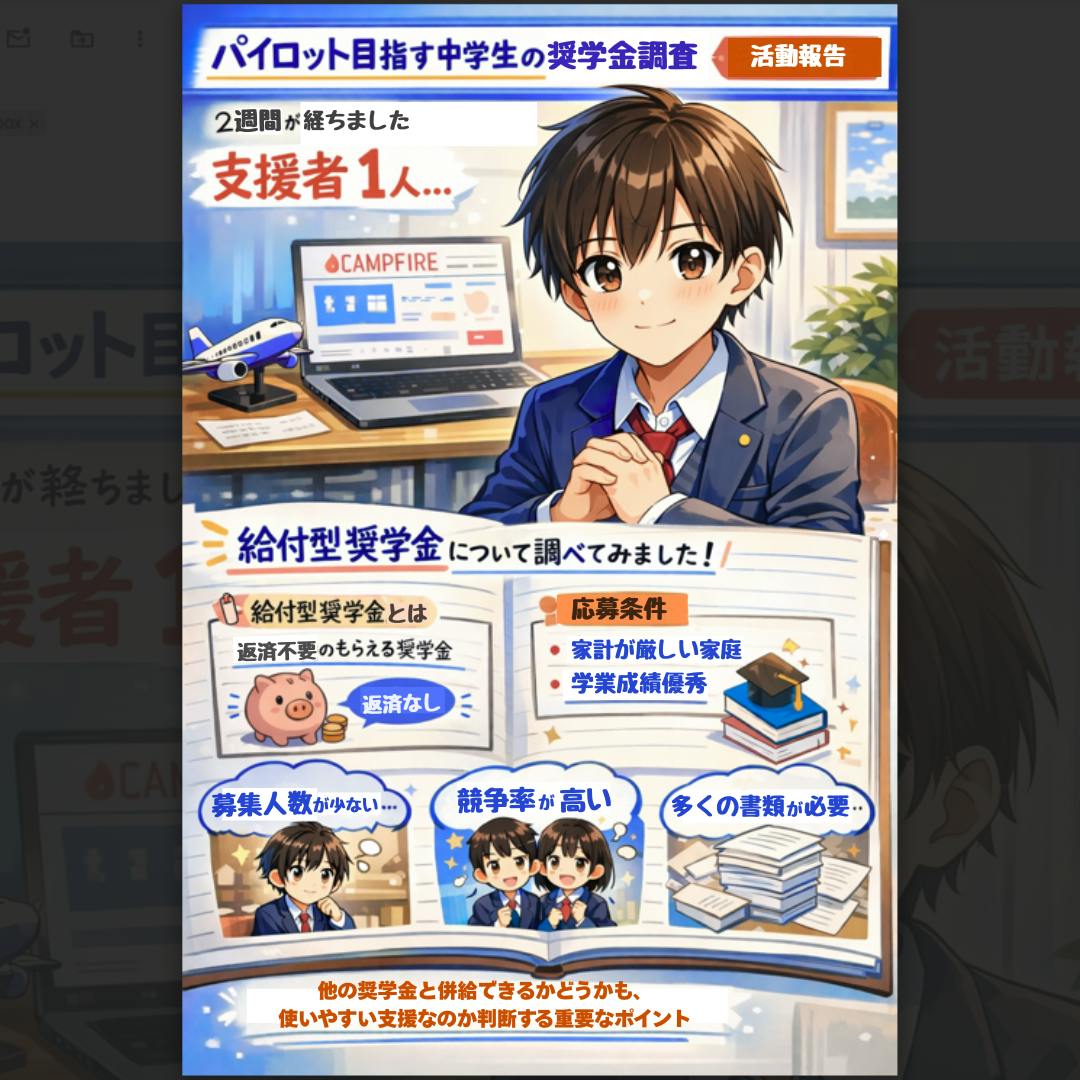 2026/01/12 21:30現役中学生が応募できる給付型奨学金の例です(2026年1月現在、国内)※以下は返済不要の給付型を中心に、 他の奨学金と併給できるもの、現在応募可能なものを抜粋しています。詳細条件は必ず公式募集要項をご確認ください○ 公益財団法人 明光教育研究所 給付型奨学金* 対象:中学生・高校生など* 内容:給付型奨学金 (中学生等:最大20万円/高校生等:最大50万円 など)* 応募期間: 2025年11月25日(火)~ 2026年1月15日(木)* 条件:あり。詳細は公式サイトをご確認ください https://www.meiko-zaidan.jp/program/list○ セーブ・ザ・チルドレン 子ども給付金~新入学サポート2026~* 対象:全国の新中学1年生・新高校1年生* 内容:子どもの学ぶ権利の保障のため、新入学に関わる費用の一部を給付します (新中学1年生 3万円/新高校1年生 5万円 )* 応募期間:2026年1月8日(木)~1月23日(金) 正午 * 条件:あり。詳細は公式サイトをご確認ください https://www.savechildren.or.jp○ あすのば 2025年度 入学・新生活応援給付金・ 対象:小学6年生(新中学1年生)・中学3年生(新高校1年生)・ 内容:(新中学1年生 3万円/新高校1年生 4万円)・ 応募期間:2026年1月5日(月)~1月20日(火)* 条件:あり。詳細は公式サイトをご確認ください https://www.usnova.org/kyufu2025調査してわかったことこの他にも* 応募期間外* 地域限定(東京都・茨城県など)* 学校長推薦が必須* 成績基準(5段階評価で平均4.0〜4.5以上)* 子どもが記入しなければならない* 日本語が母国語でない世帯、公的支援が受けられない世帯・・・ といった条件付きの奨学金がいくつか存在しましたまた、 他の奨学金と併給できるかどうかも、 実際に使いやすい支援かどうかを判断する重要なポイントだと感じました今回のまとめについて今回の奨学金情報は、ひとり親家庭の中学生でも探しやすいように整理したものです実際の* 募集要項* 対象年齢* 支給金額* 応募期限については、必ず公式サイトでの確認をお願いしますこれからも、 「中学生でも、進学を諦めなくていい社会」を目指して、 調査と発信を続けていきます今回の調査も、皆さまのご支援があってこそ進めることができました 本当にありがとうございます もっと見る