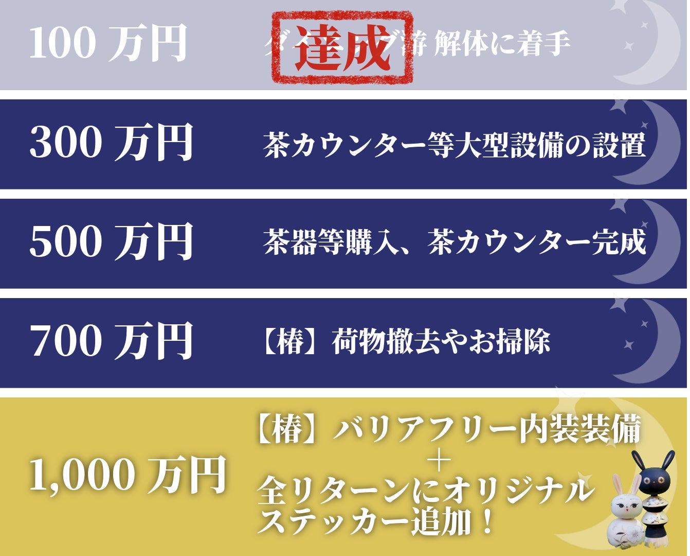 2026/04/09 18:55こんにちは。名月莊です。皆様にご支援頂いております私たちのクラウドファンディングは、開始約3週目で支援金額100万円を達成致しました!皆様の温かいご支援に心より感謝申し上げます。プロジェクトは5月末まで続きますので、引き続きご注目を頂けますと幸いです!さて、プロジェクトページでもお伝えしておりました「カウンターダイニング游」のリニューアルの為の解体作業ですが、おかげさまで着々と工事が進んでおります。プロジェクト実施の1つ目の目標であるカウンター茶房増設の達成の為、まだまだ頑張って参ります。皆様においしい山形文化をお届けできる日も近いです…!また、ファーストゴール達成を受け、ネクストゴールを200万円とさせて頂きました。リターンも随時追加して参りますので、引き続きのご注目、宜しくお願いいたします!名月莊 もっと見る