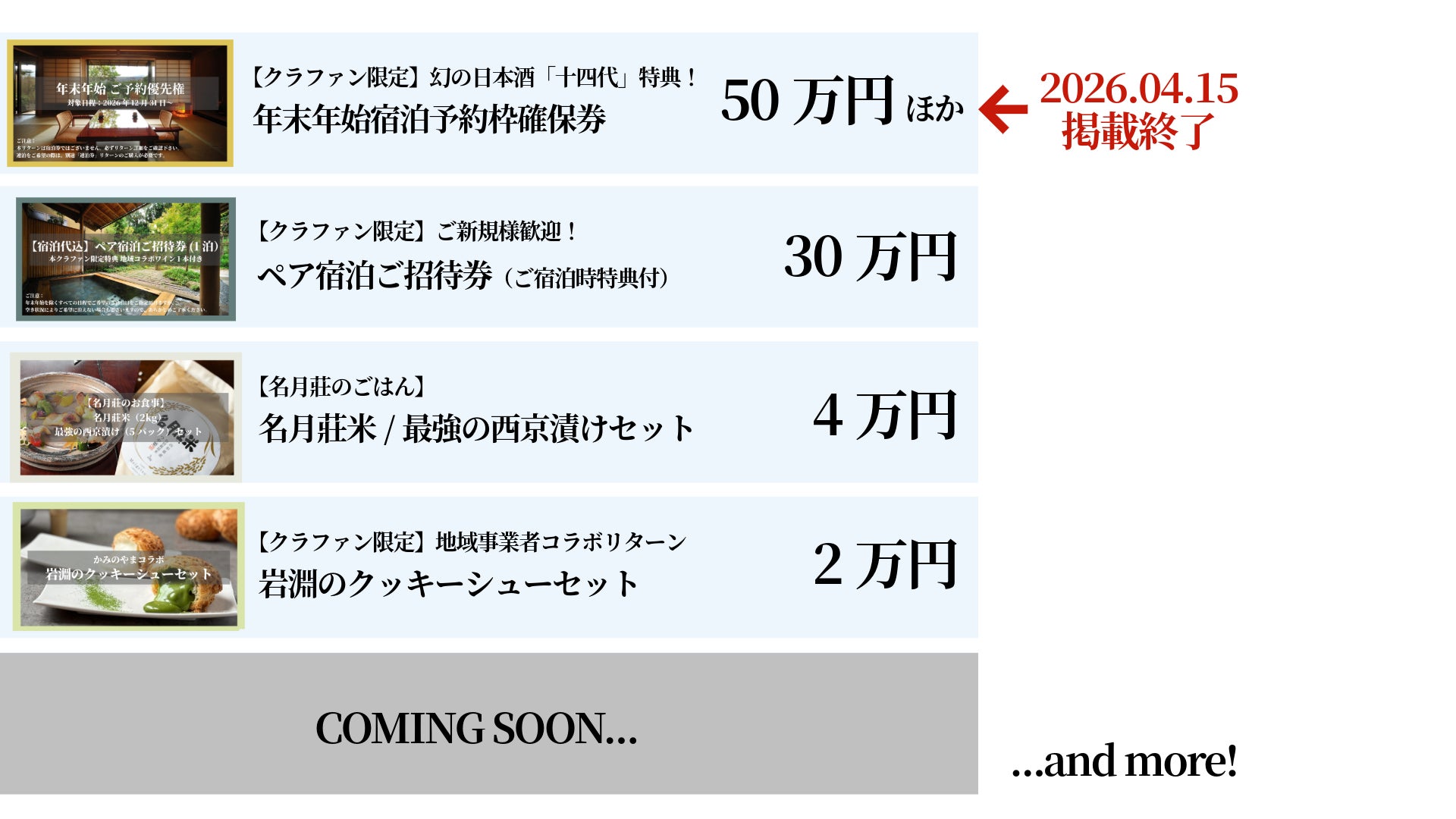 2026/04/17 18:06ご支援者の皆様こんにちは。名月莊です。私たちのクラウドファンディングへのご支援、誠にありがとうございます!プロジェクト開始日より掲載しておりました「年末年始ご予約枠確保権」につきまして、4月20日の10時頃を以て募集を終了させて頂く運びとなりました。普段のご予約では人気が殺到し、ご予約を頂けないお客様も多数いらっしゃる年末年始のご宿泊枠。今回は、私たちのクラウドファンディングを応援して下さる支援者様へ、特別にご予約枠を確保させて頂いております。また限定特典として、山形県で幻と言われる日本酒もご提供。ご支援くださった皆様へ、心からのおもてなしをご提供させて頂きます。詳細につきましては、プロジェクトページのリターン及びリターン詳細を必ずご確認下さい。引き続き、私たちの挑戦を見守って頂けますと幸いです。宜しくお願いいたします! もっと見る